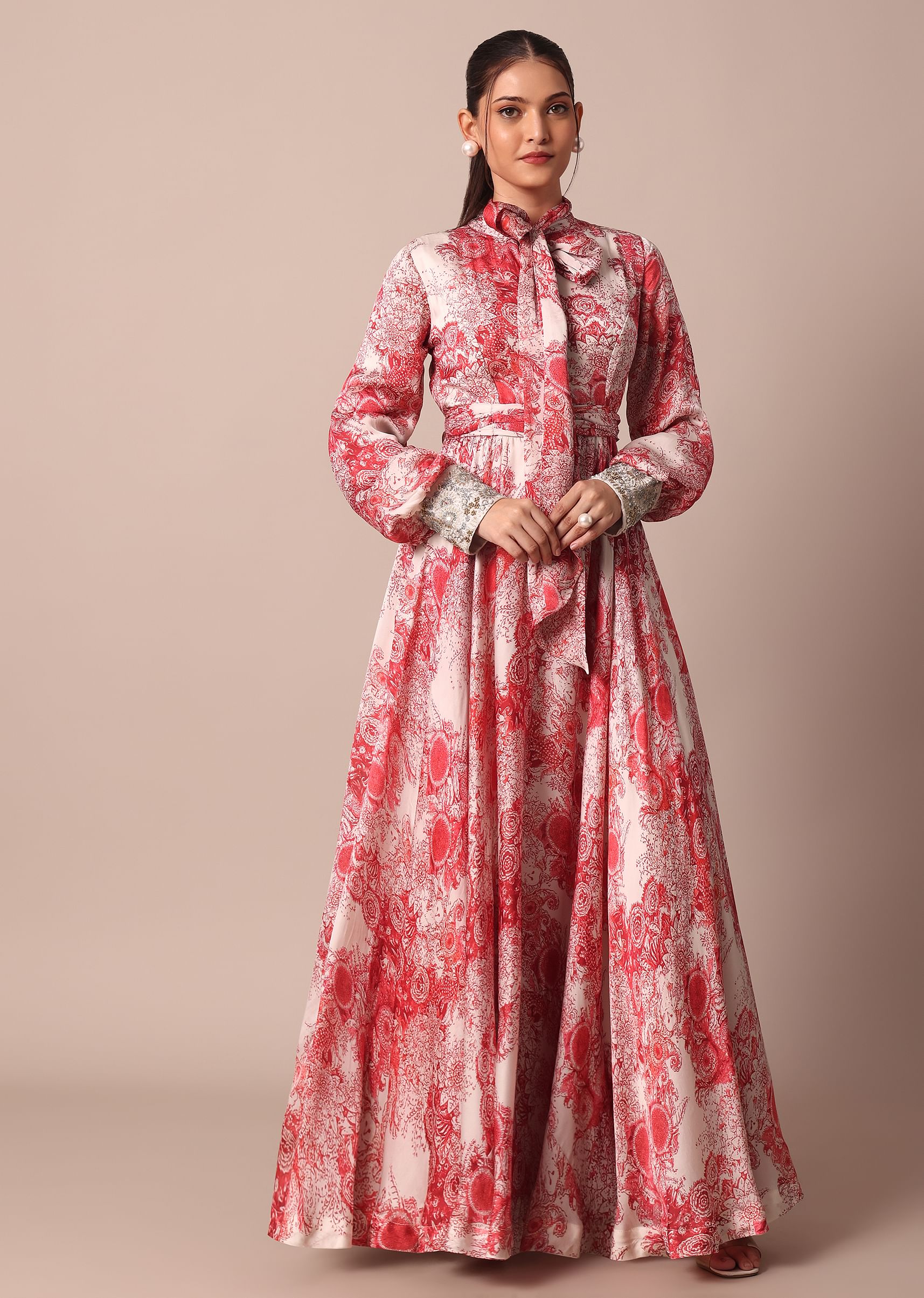 Classic Red Crepe Printed Gown With Embroidered Sleeves