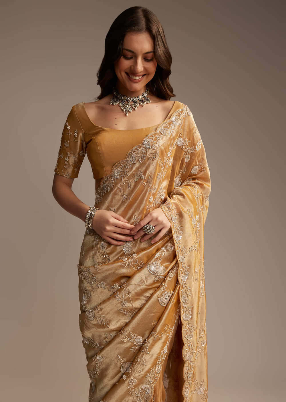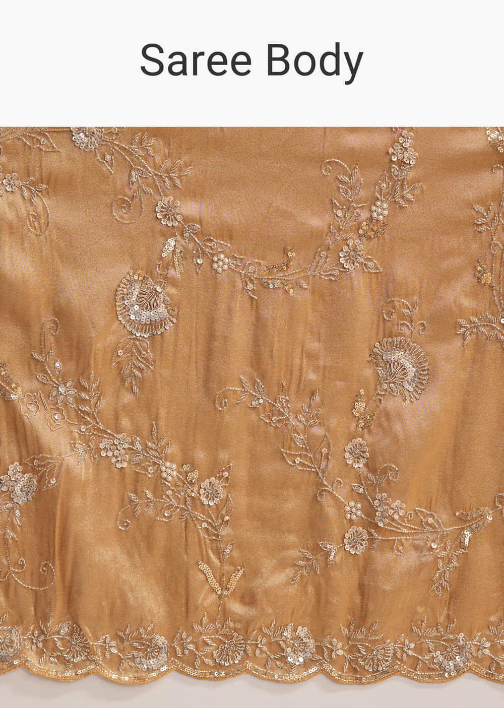 This copper tissue saree doesn’t play safe - it plays bold. With a luminous base that shifts between metallic warmth and festive firelight, it’s layered with a dense floral jaal embroidered across every inch. Cutdana, sequins, moti, and beads work together like a livewire, catching flashes of movement and sound with every step. The scalloped border breaks the linear with curve. A quiet rebellion in a garment that already doesn’t ask for permission.