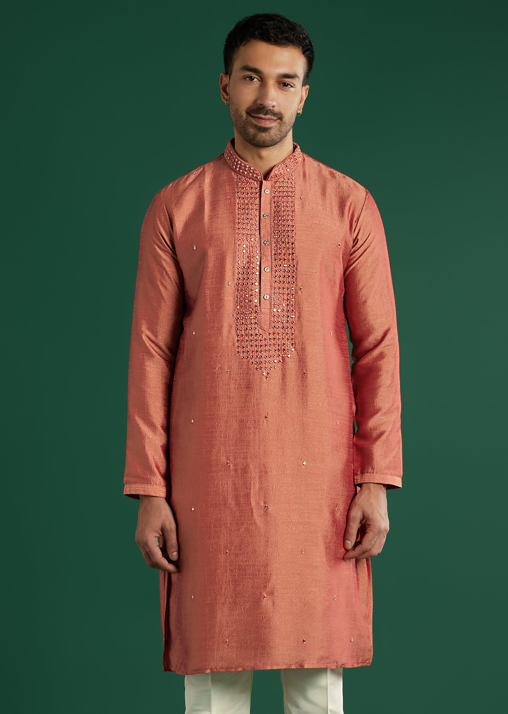 Bright and celebratory, this coral art silk men’s kurta set is scattered with mirror work across the body for a lively shimmer. The glossy base, mandarin collar, and white churidar keep the look crisp and balanced. Bring it out for Festive Functions when colour and sparkle belong at centre stage. Awarded as the Most Trusted Brand, we're delivering styles you love, just as promised.