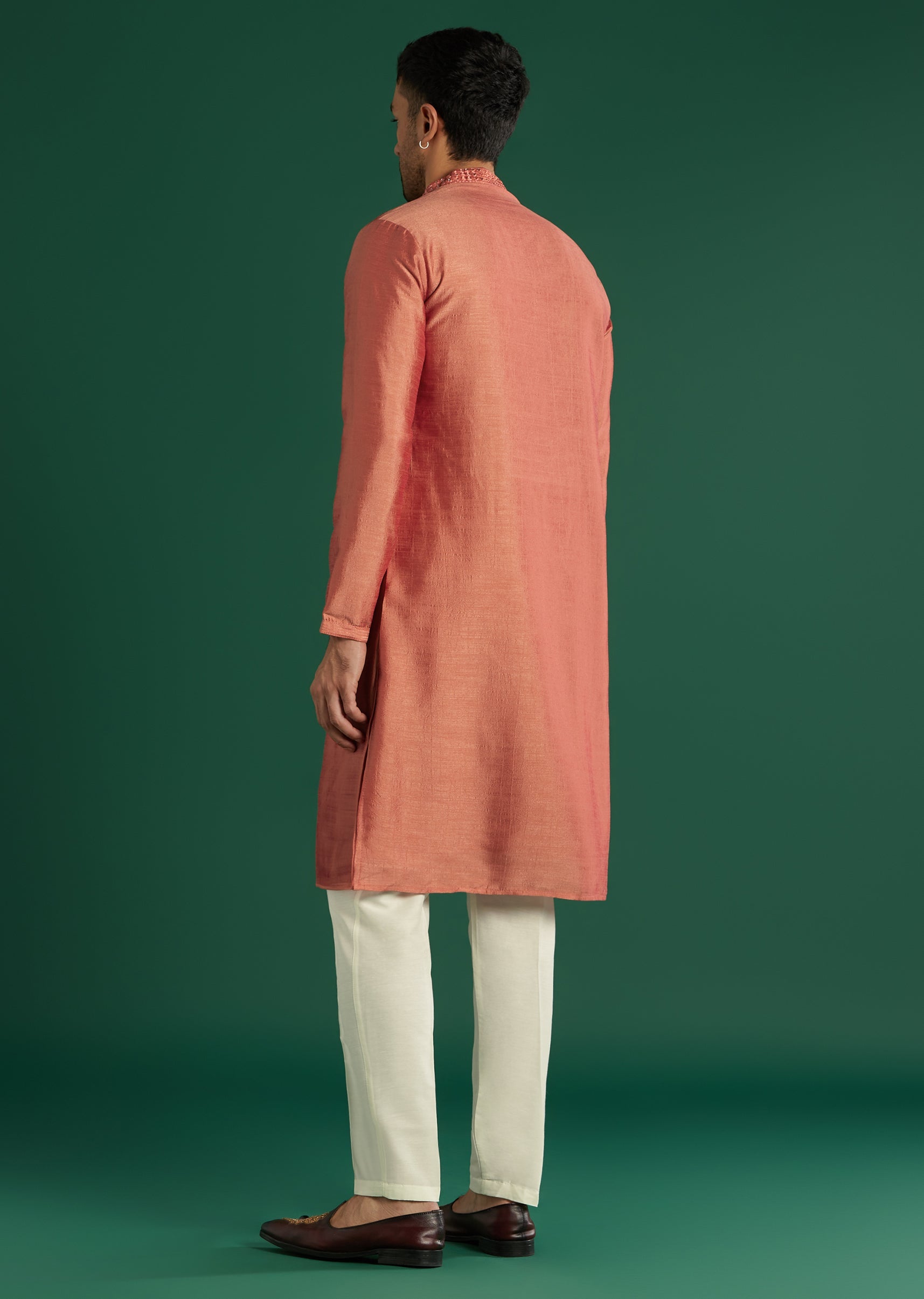Bright and celebratory, this coral art silk men’s kurta set is scattered with mirror work across the body for a lively shimmer. The glossy base, mandarin collar, and white churidar... More Product Details