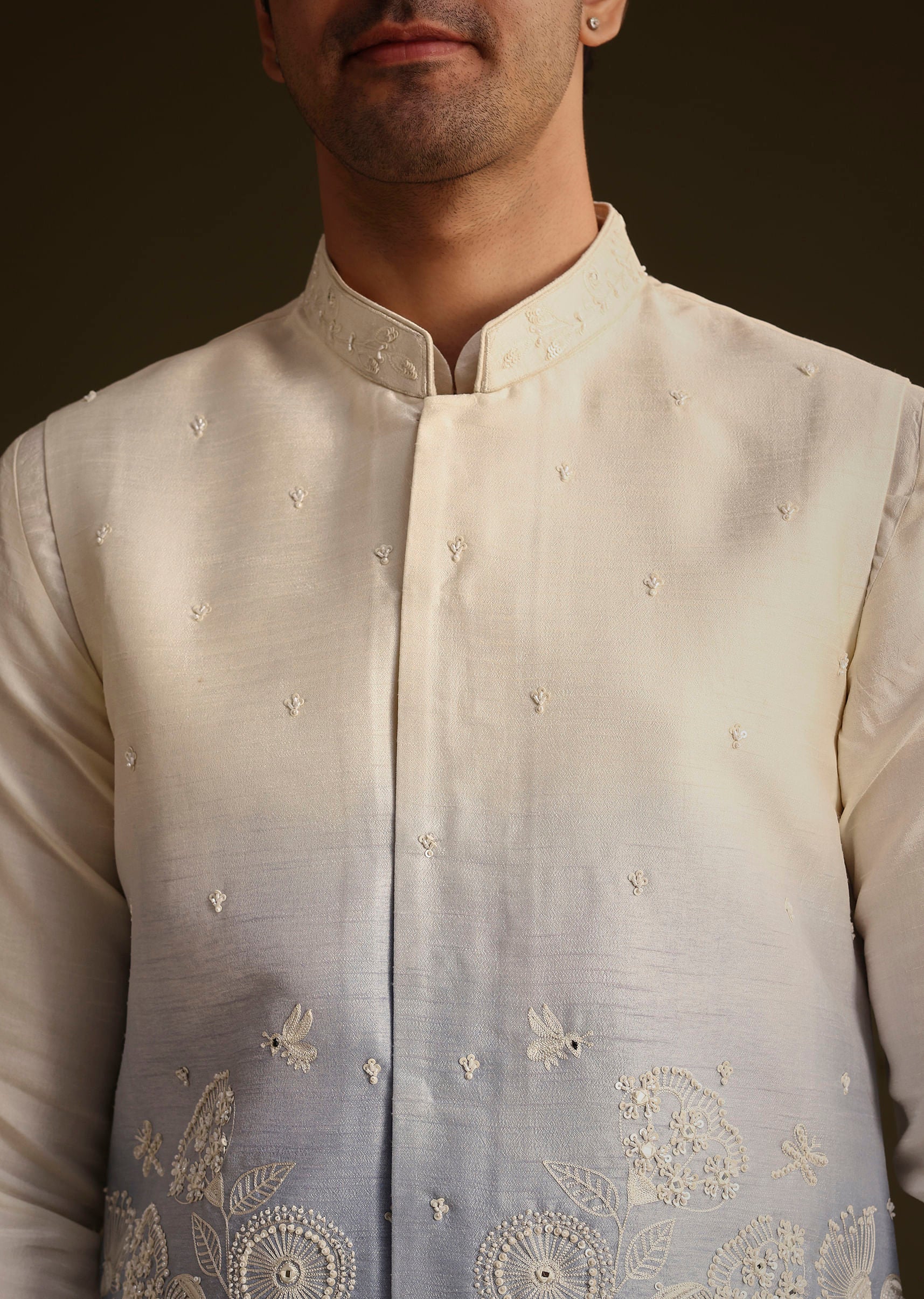 Cream And Blue Ombre Embroidered Silk Jacket Set
