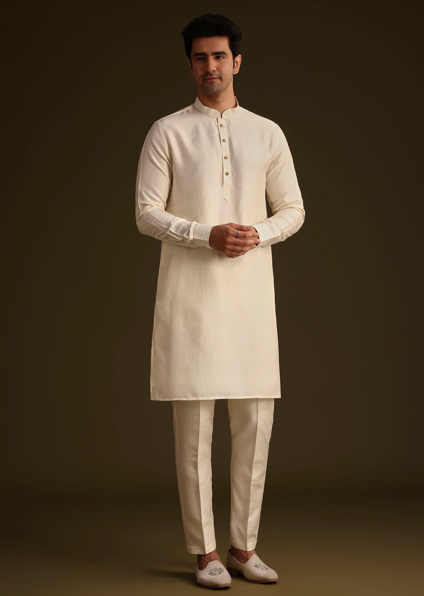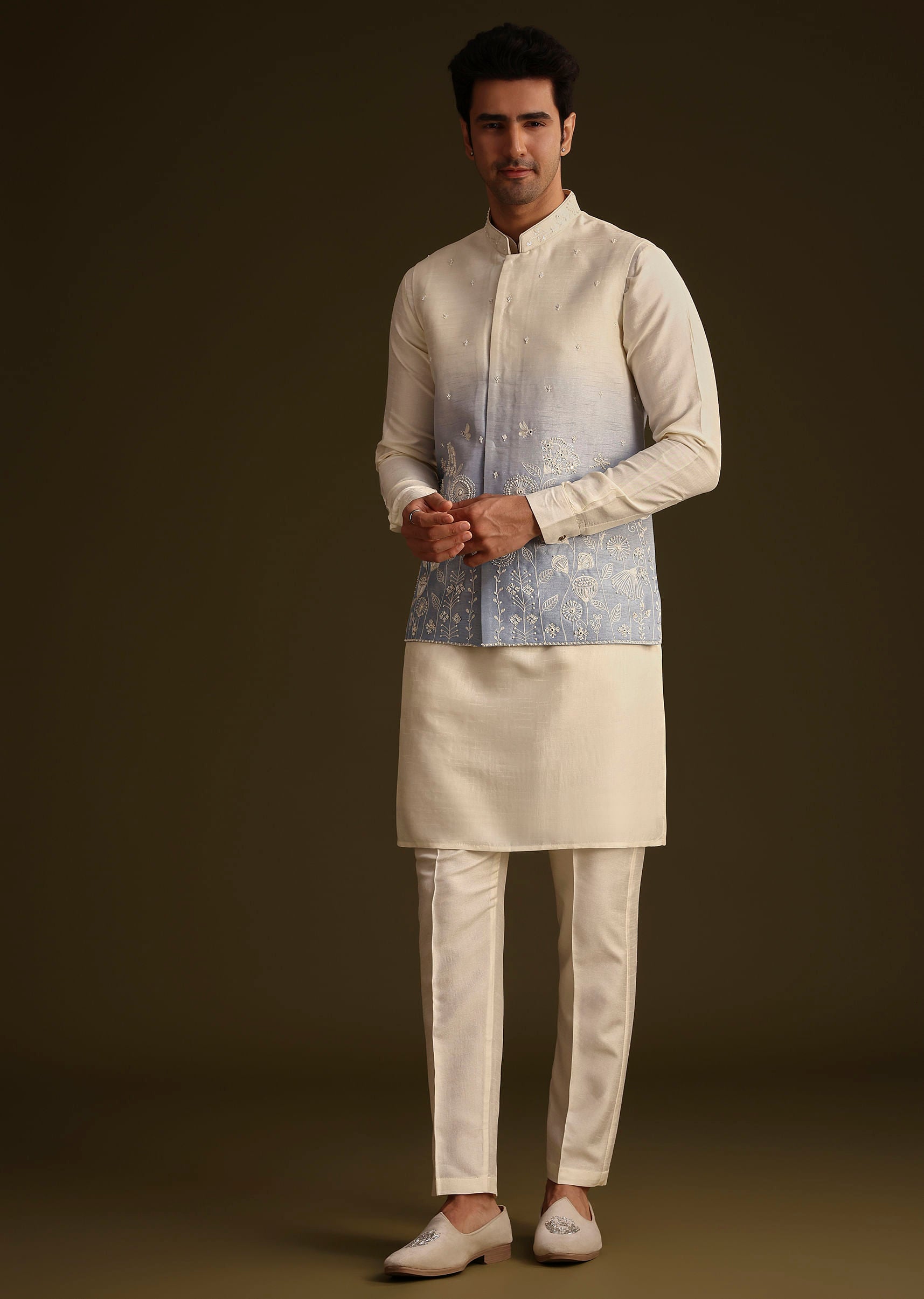 Elevate your ethnic style with this cream and blue ombre embroidered silk jacket set, showcasing a delicate gradient and intricate embroidered patterns. The soft silk fabric paired with a classic kurta and tailored bottom exudes understated sophistication, making it perfect for weddings, engagements, and festive celebrations. This ensemble blends serene hues with modern tailoring for a timeless yet contemporary look.