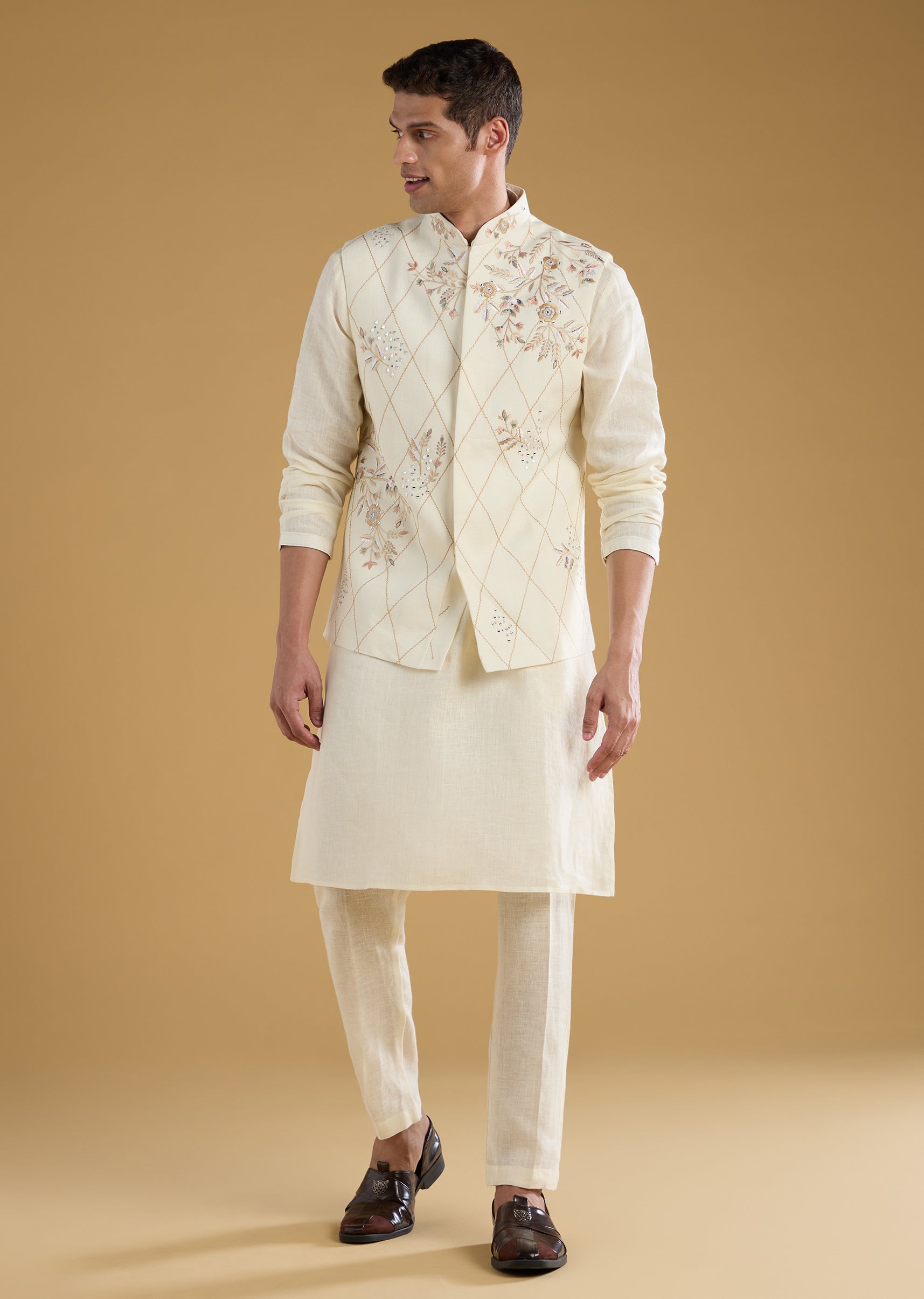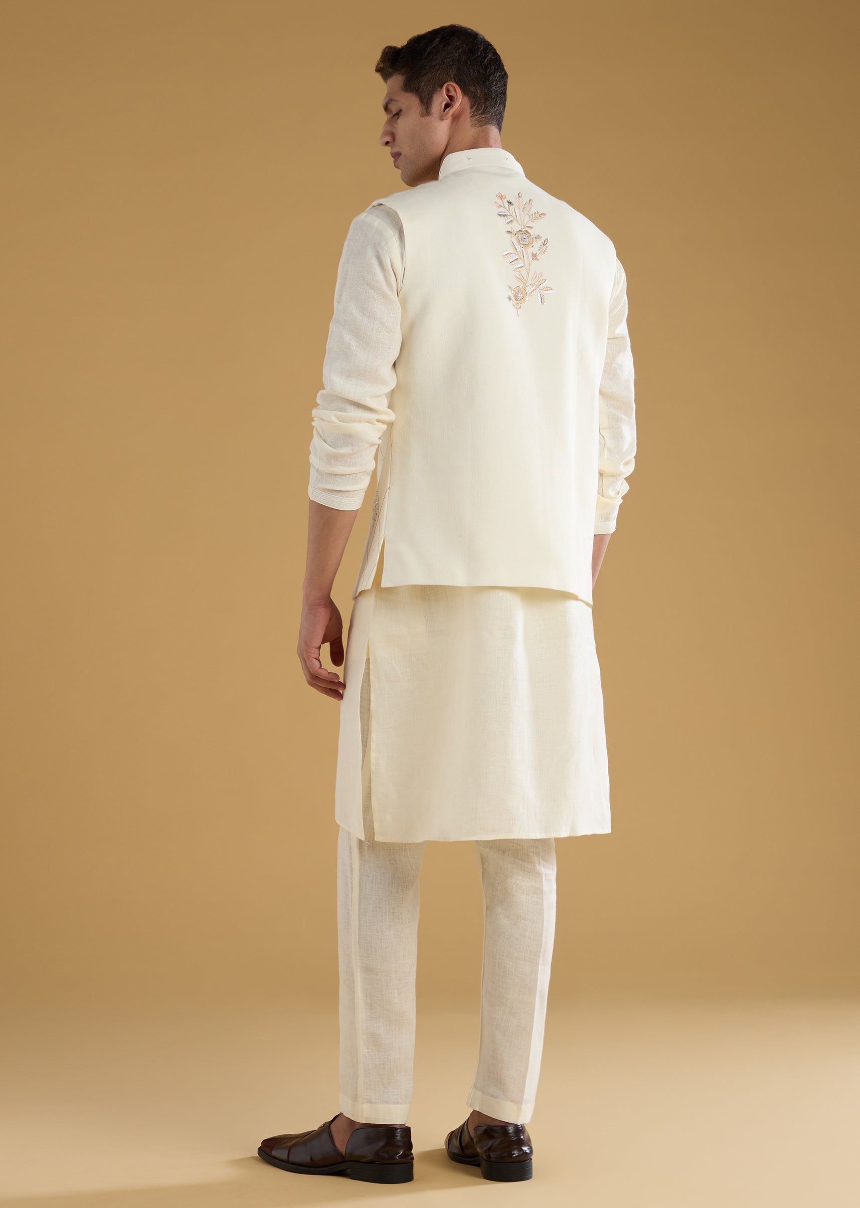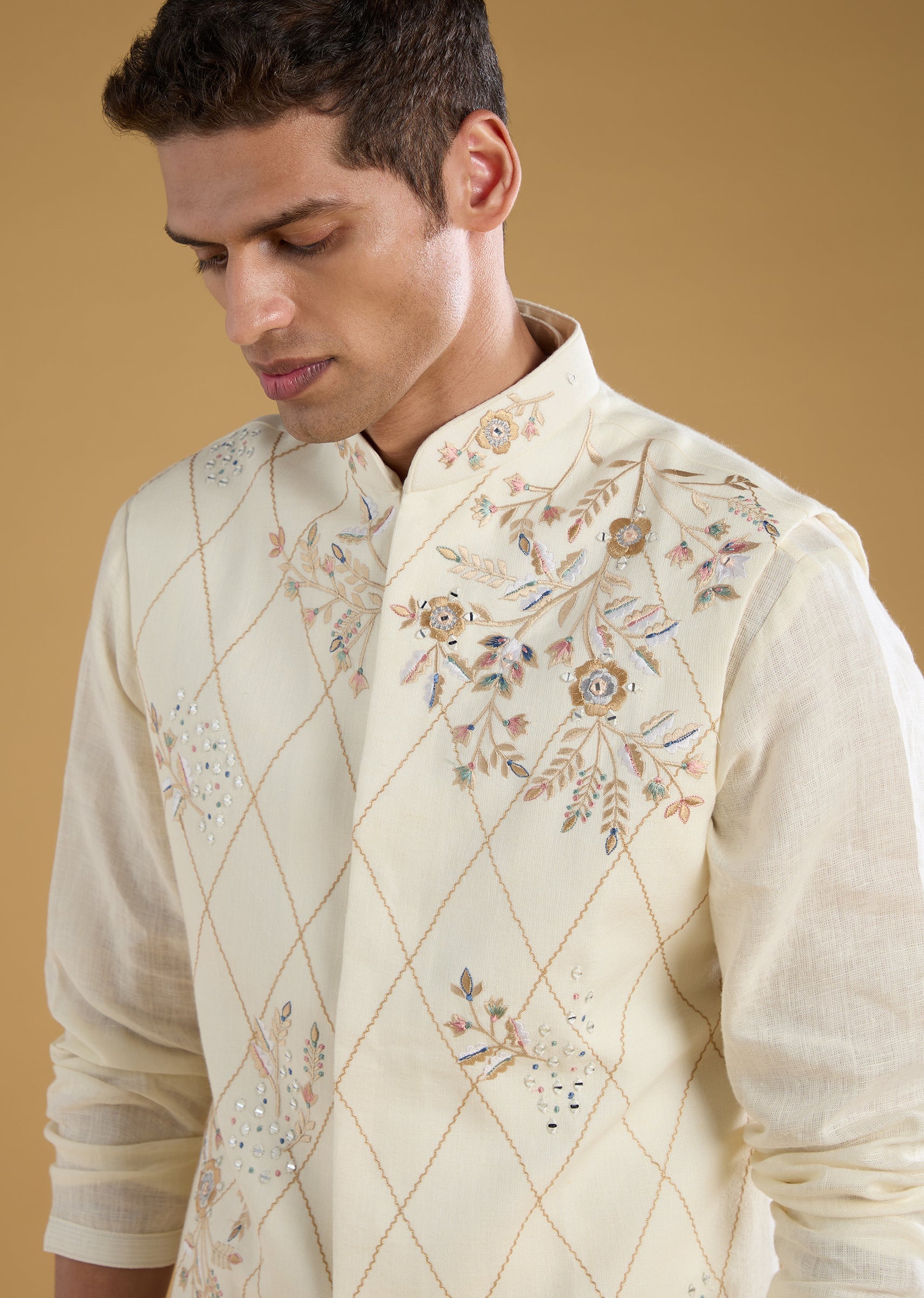 Cream Art Silk Embroidered Jacket and Kurta Set