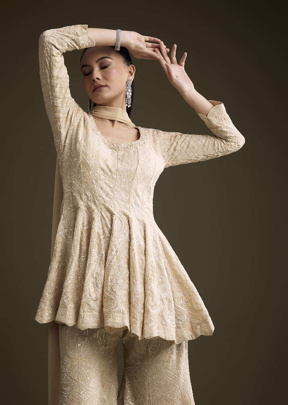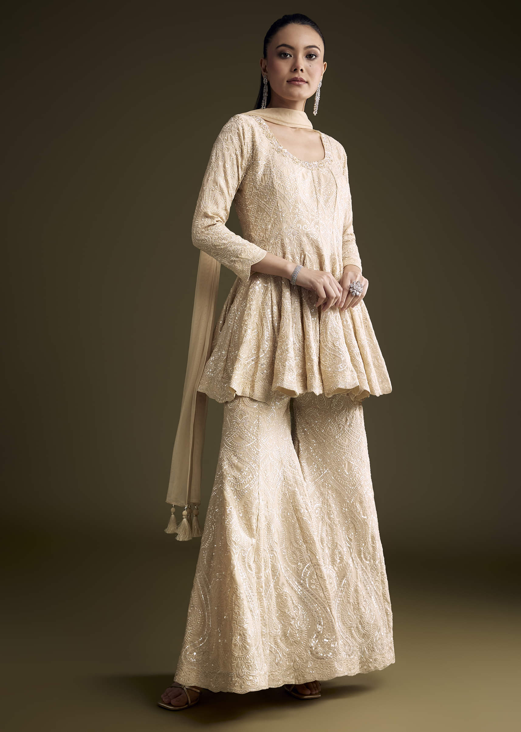For sparkle that stays easy to wear, this cream chinon palazzo suit keeps the drape fluid and the finish refined. Sequins and resham work lift the peplum-style kurta so the... More Product Details