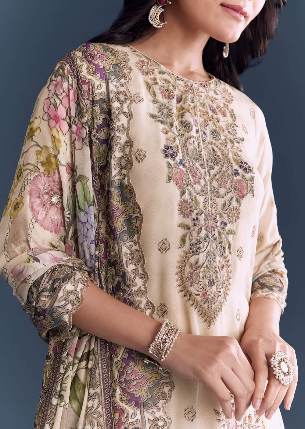 For a look that reads curated, this cream crepe kurta set pairs a subtle indie print with a floral print dupatta for contrast. Light zari work adds a neat finish... More Product Details