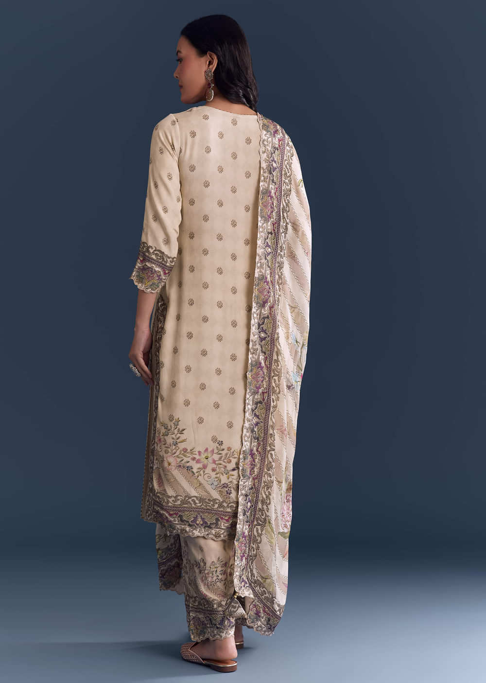 Cream Crepe Kurta Set With Indie Print And Floral Print Dupatta