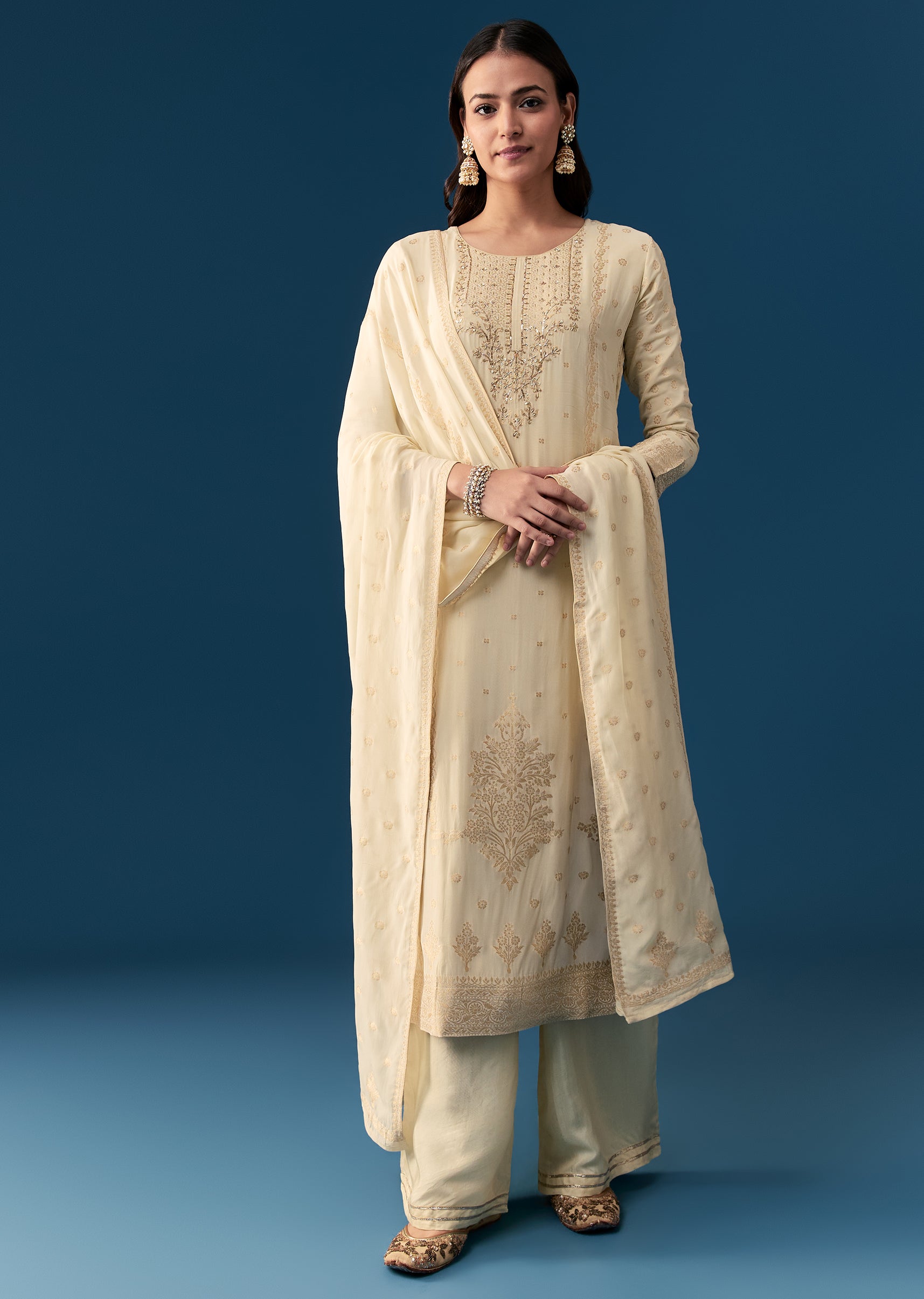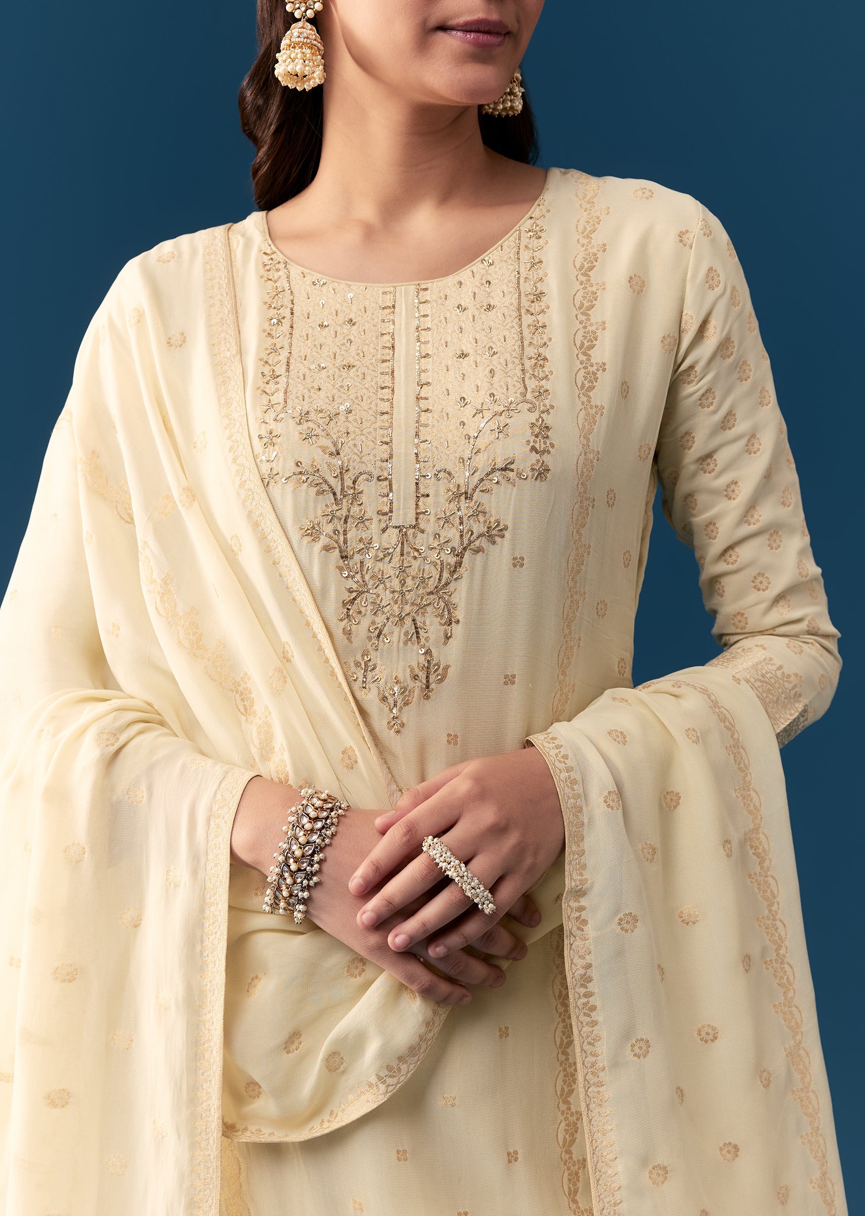 Embrace subtle elegance with this pastel cream kurta set in a straight classic silhouette. Crafted from soft georgette fabric, the kurta features intricate zardosi embroidery along the 3 4th sleeves... More Product Details