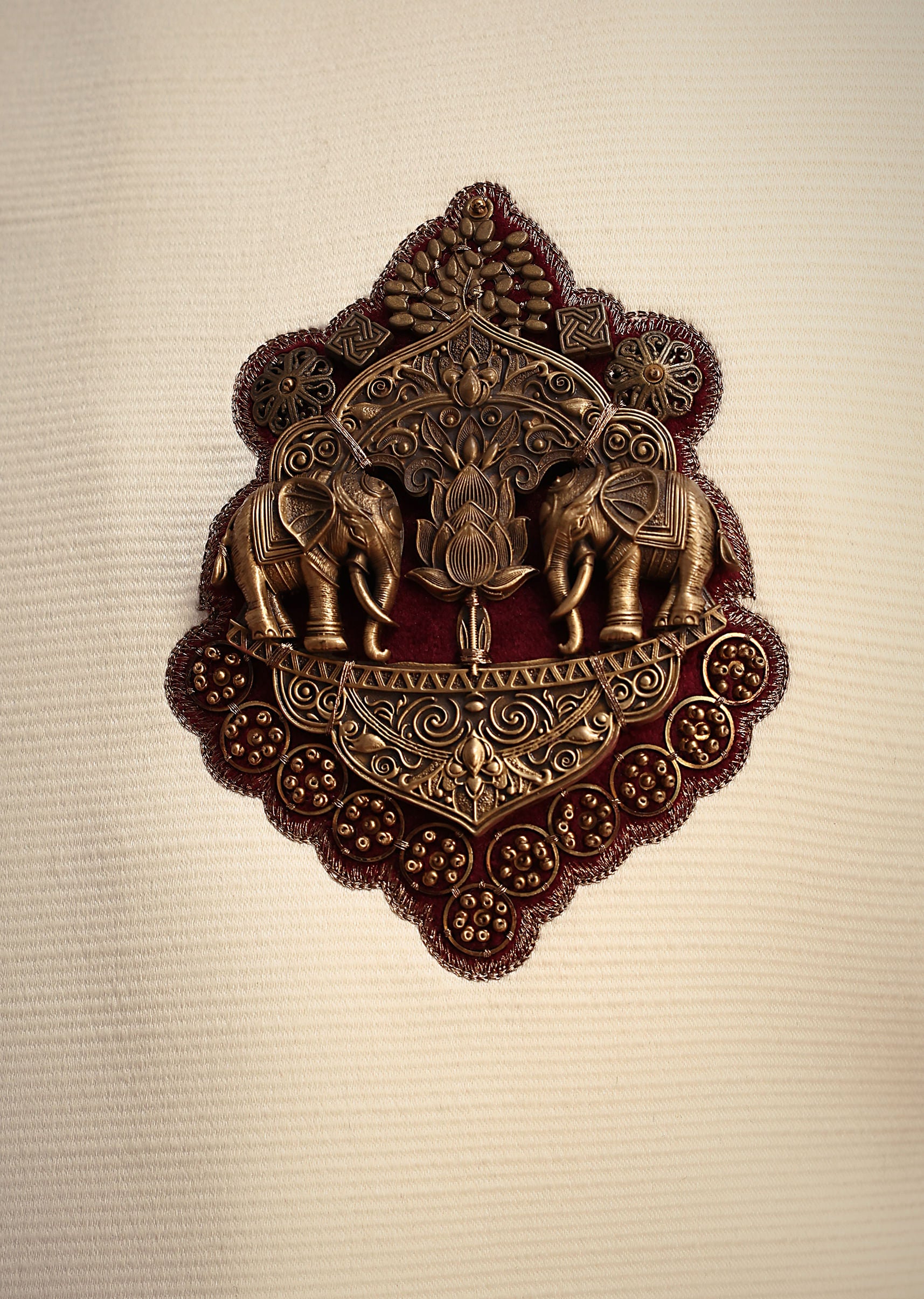 - This cream Jodhpuri set with velvet patchwork broach exudes luxury and style.
