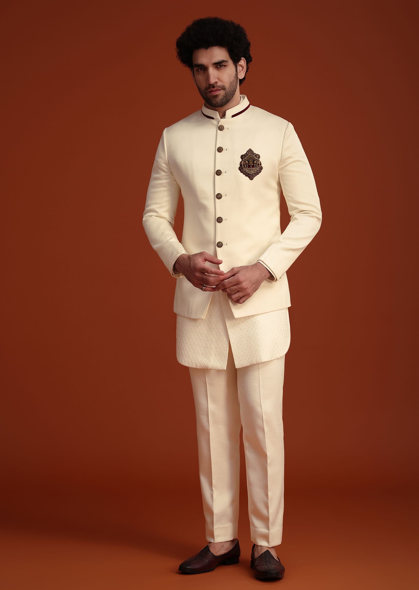 Cream Kurta Jodhpuri Set With Velvet Patch Work Broach