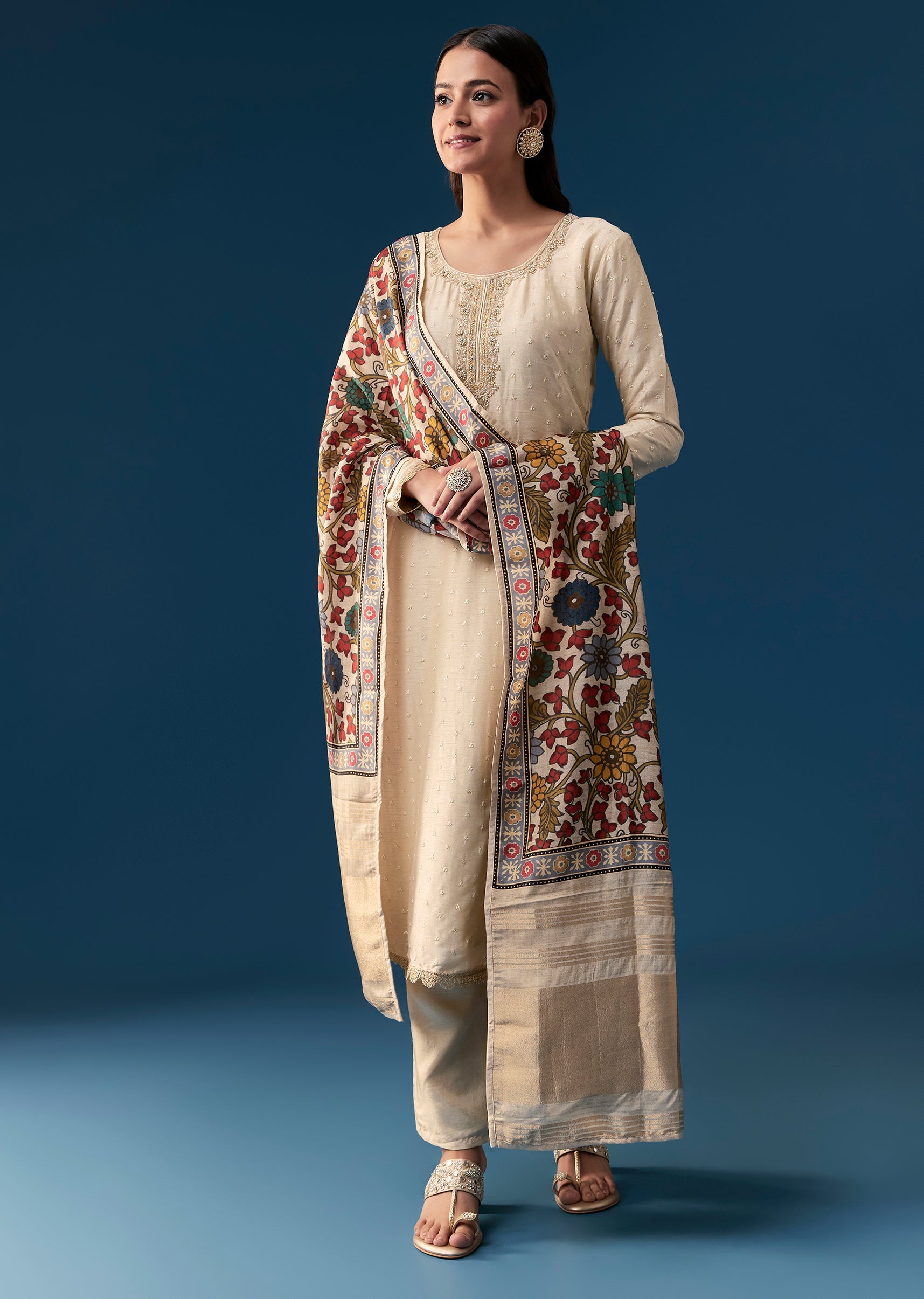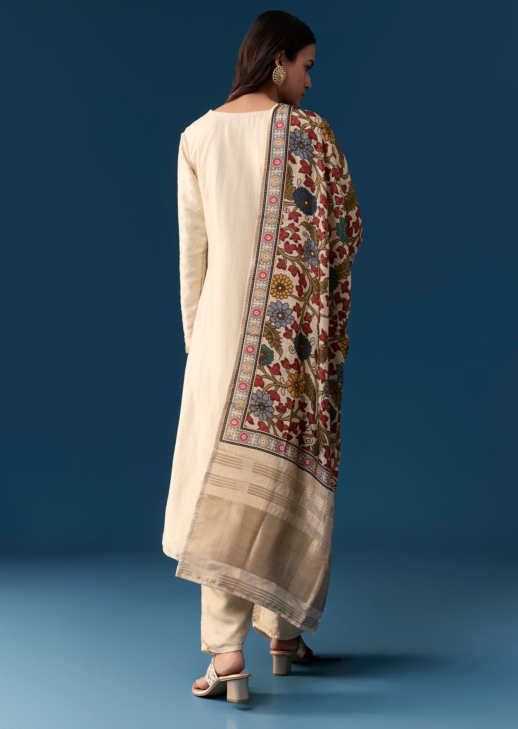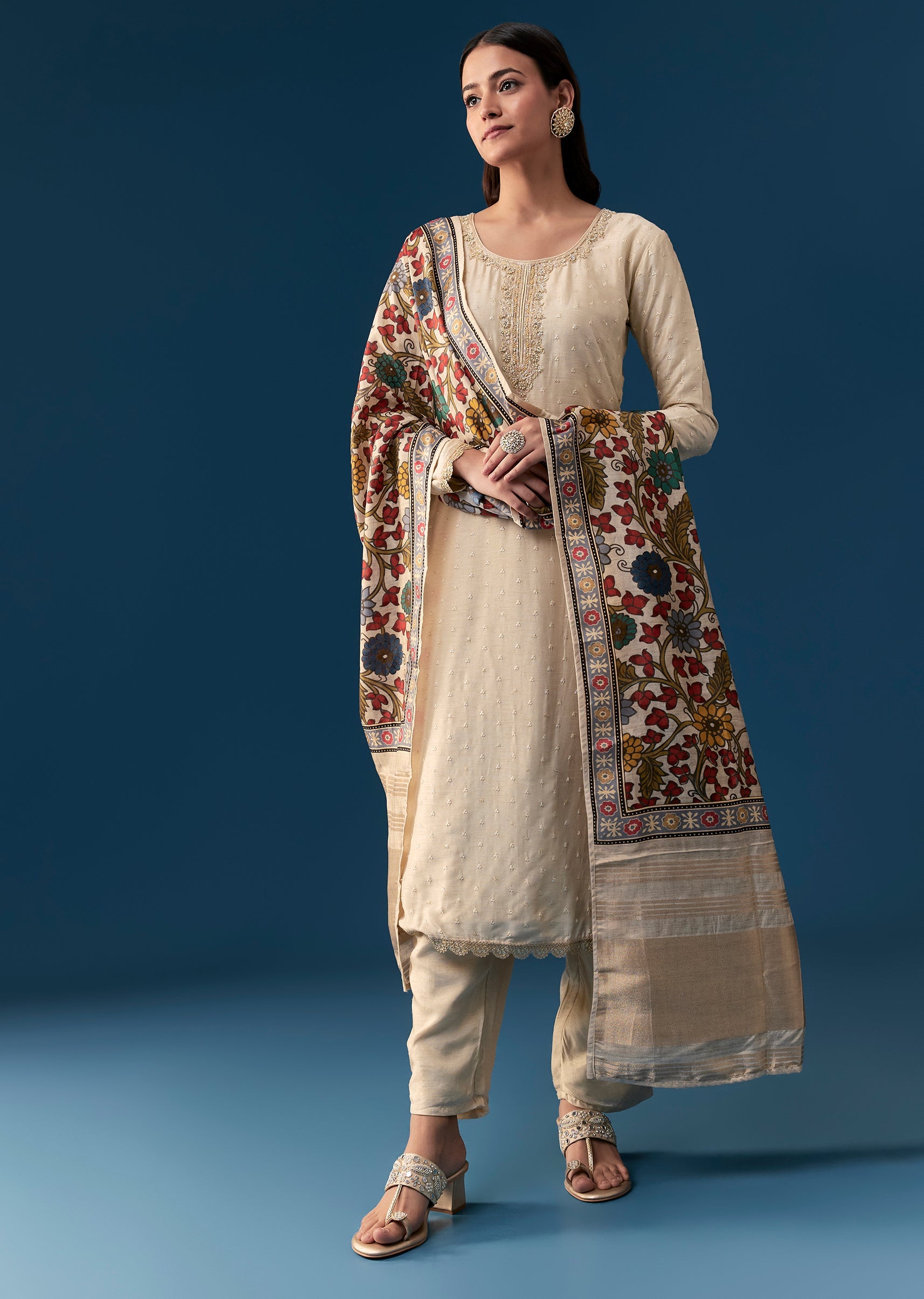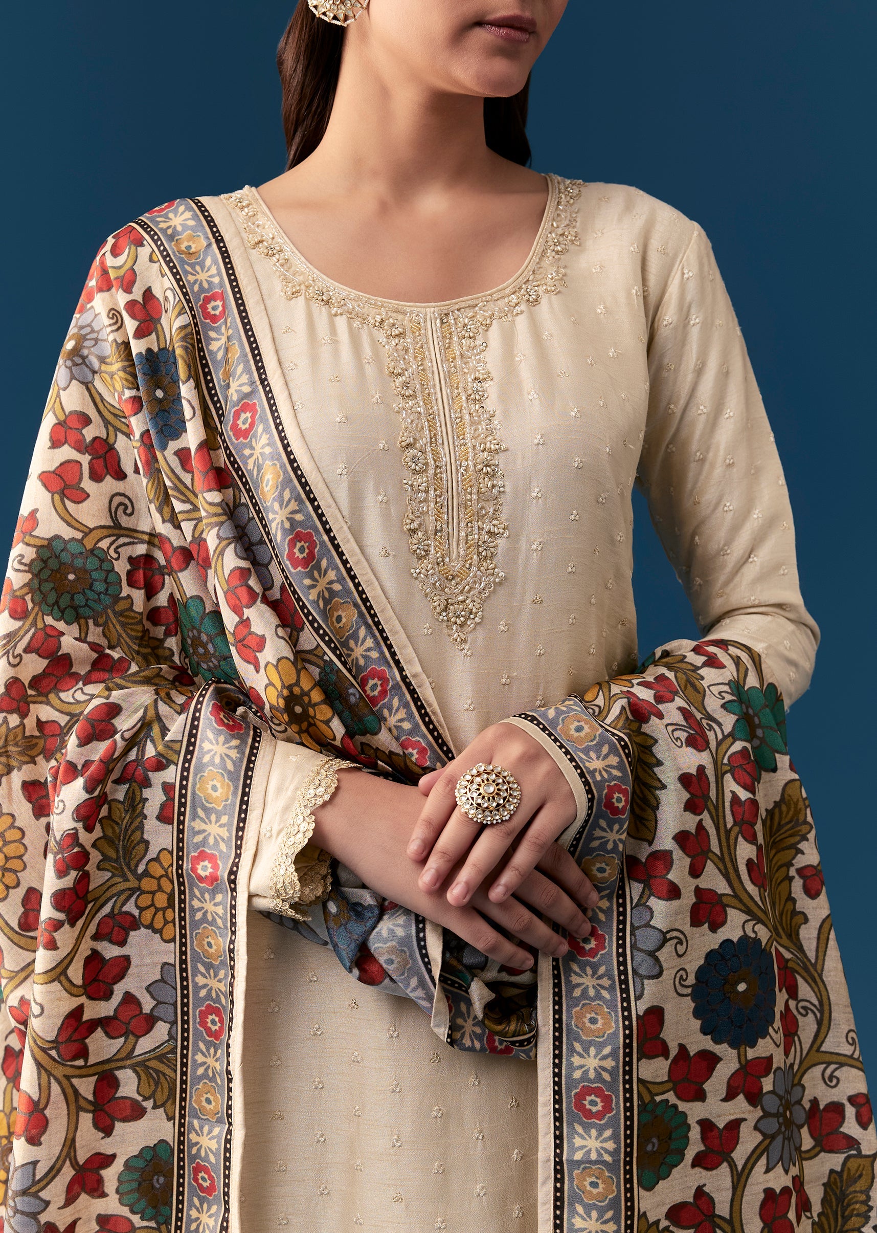 Exude timeless elegance with this cream kurta set adorned with intricate resham embroidery all over the kurta. The neckline is enhanced with delicate cut dana and moti work, adding a... More Product Details