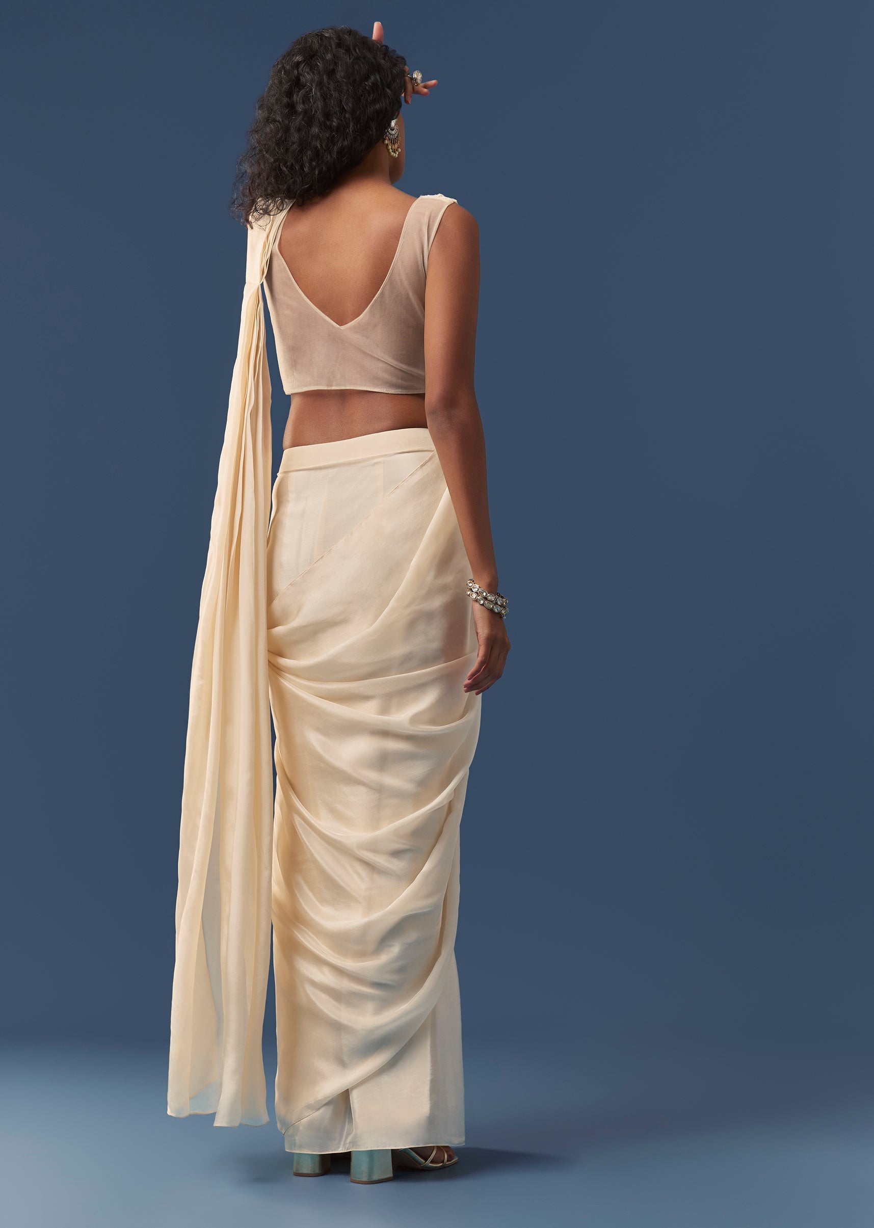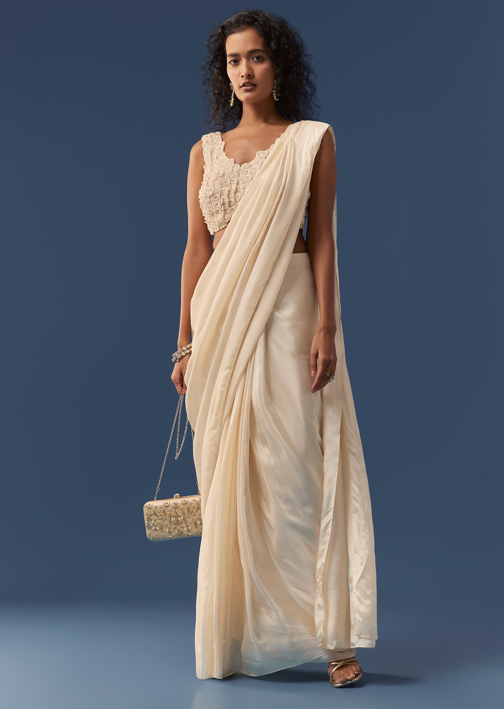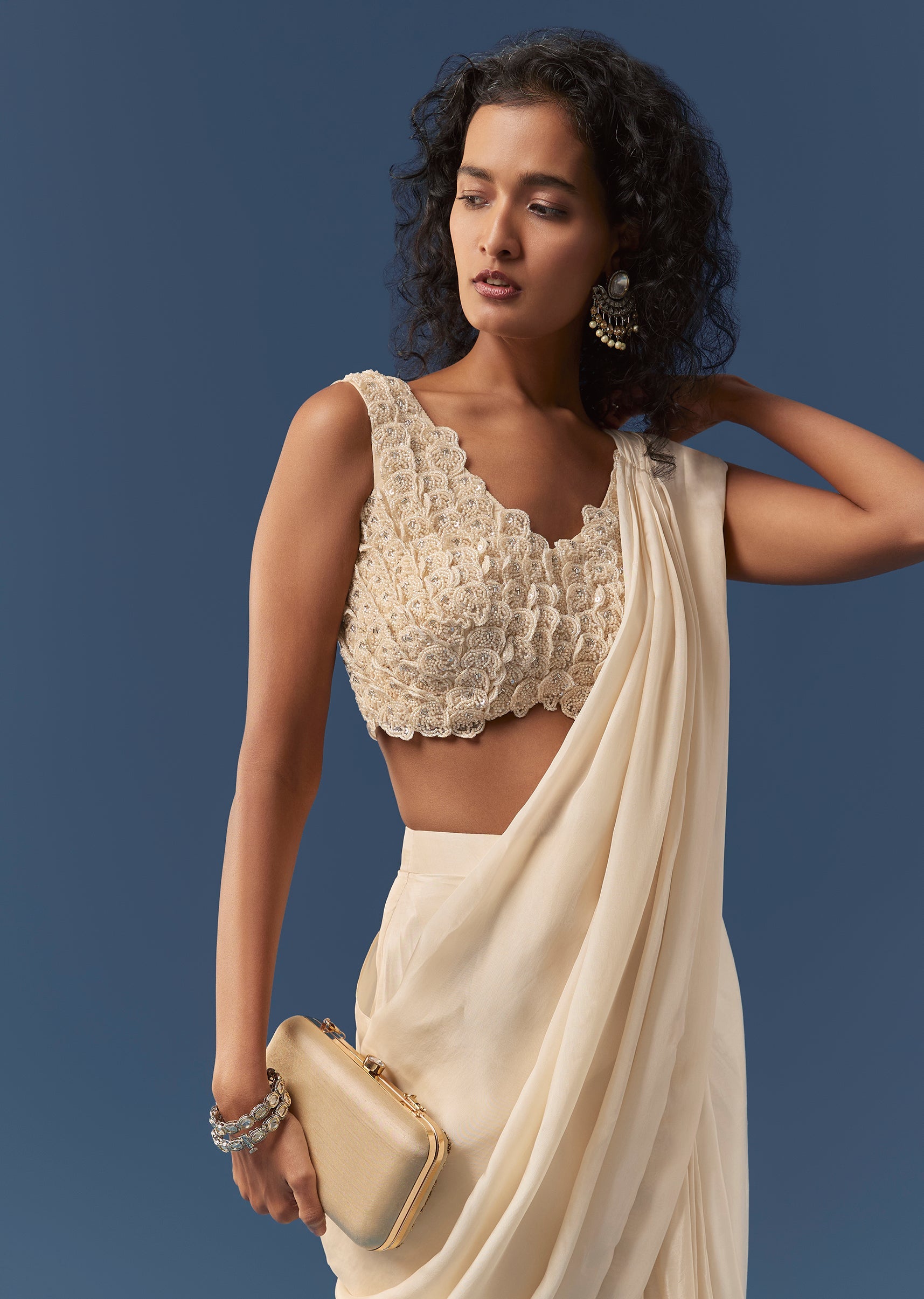 Sleek and glamorous, this beads work blouse with pre drape saree is designed for effortless statement dressing. The sleeveless crepe blouse features delicate bead embellishments and a flattering V neckline... More Product Details