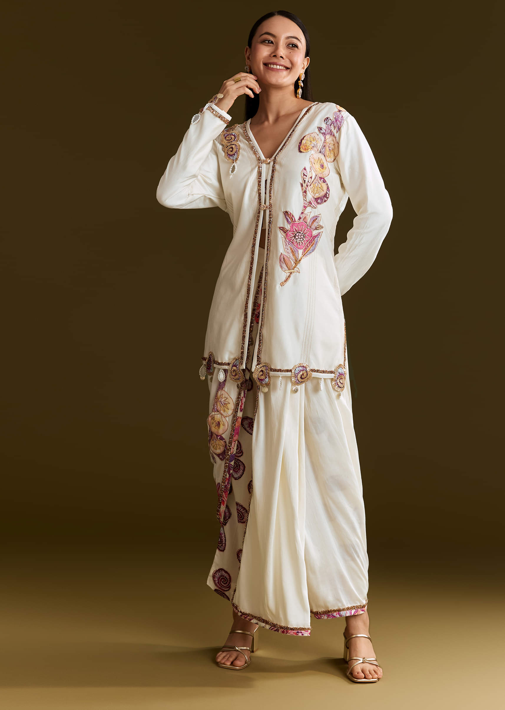 This printed cream ensemble fuses a stylish croptop, a gotta work jacket, and dhoti-style skirt—a perfect party starter with traditional flair. Awarded as the Most Trusted Brand, we're delivering styles... More Product Details