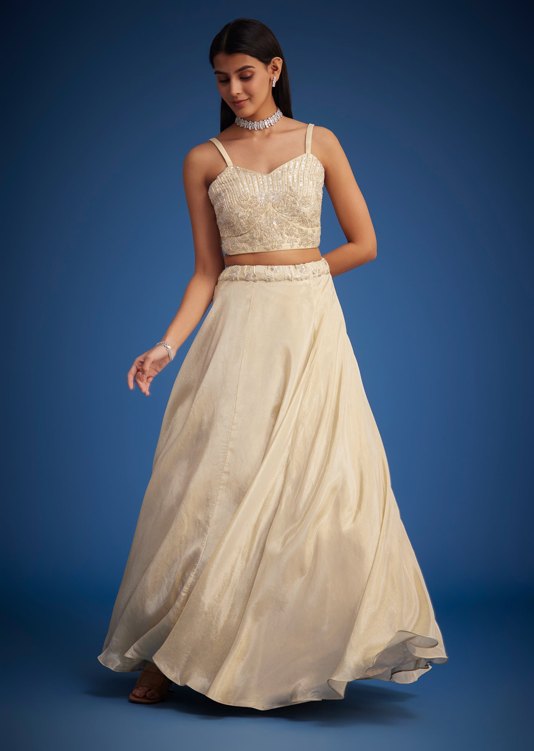 Radiate timeless elegance with this Cream Raw Silk Lehenga Set, exquisitely adorned with Sequins, Cut Dana, Beads, and delicate Thread embroidery. The flowing Tissue lehenga pairs gracefully with a structured embroidered bustier, while the intricately detailed jacket adds a contemporary touch. Designed for receptions, festive soirées, and modern wedding celebrations, this ensemble blends heritage craftsmanship with modern sophistication. The soft cream hue and luxurious textures create an effortlessly regal statement. Awarded as the Most Trusted Brand, we're delivering styles you love, just as promised.