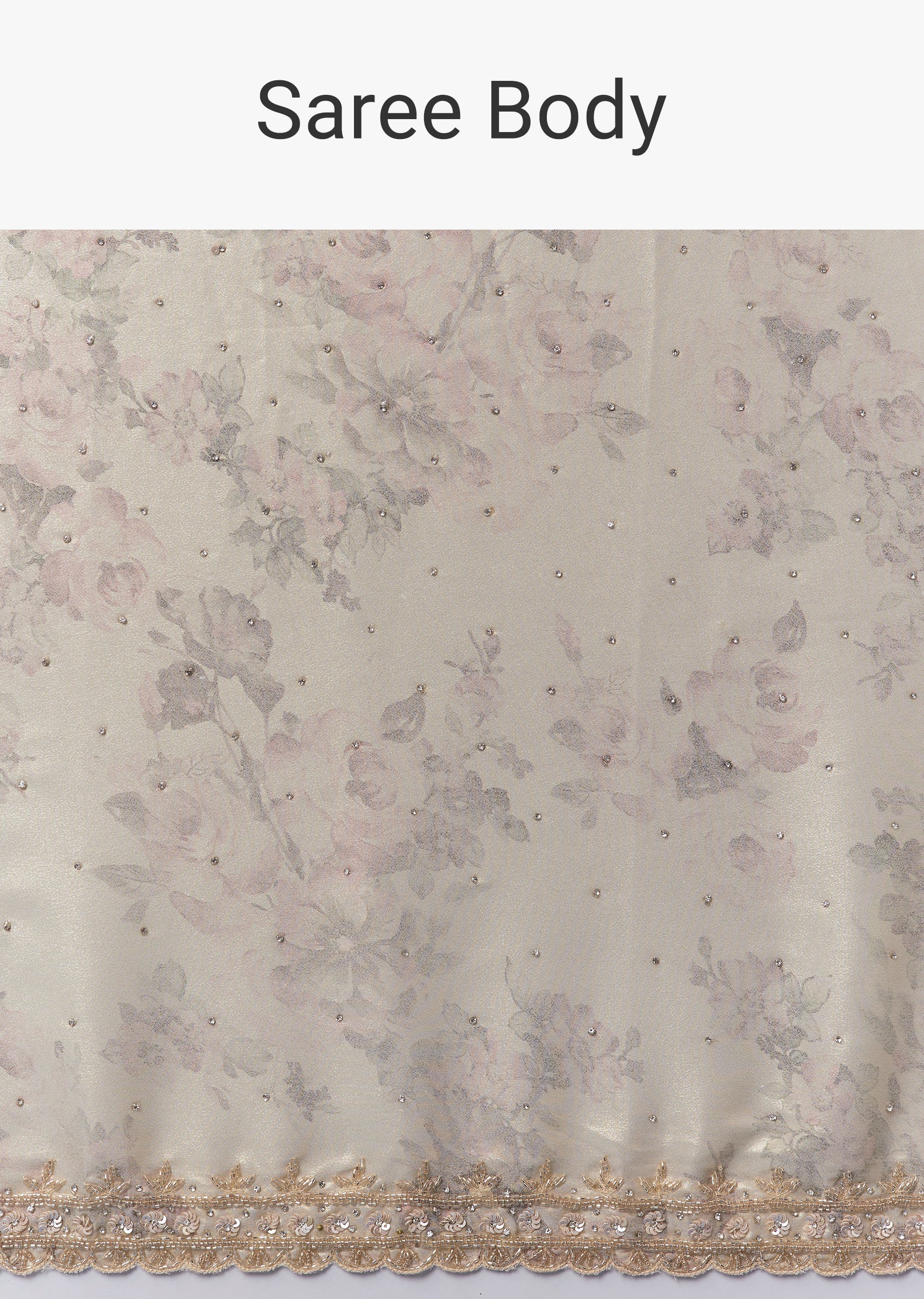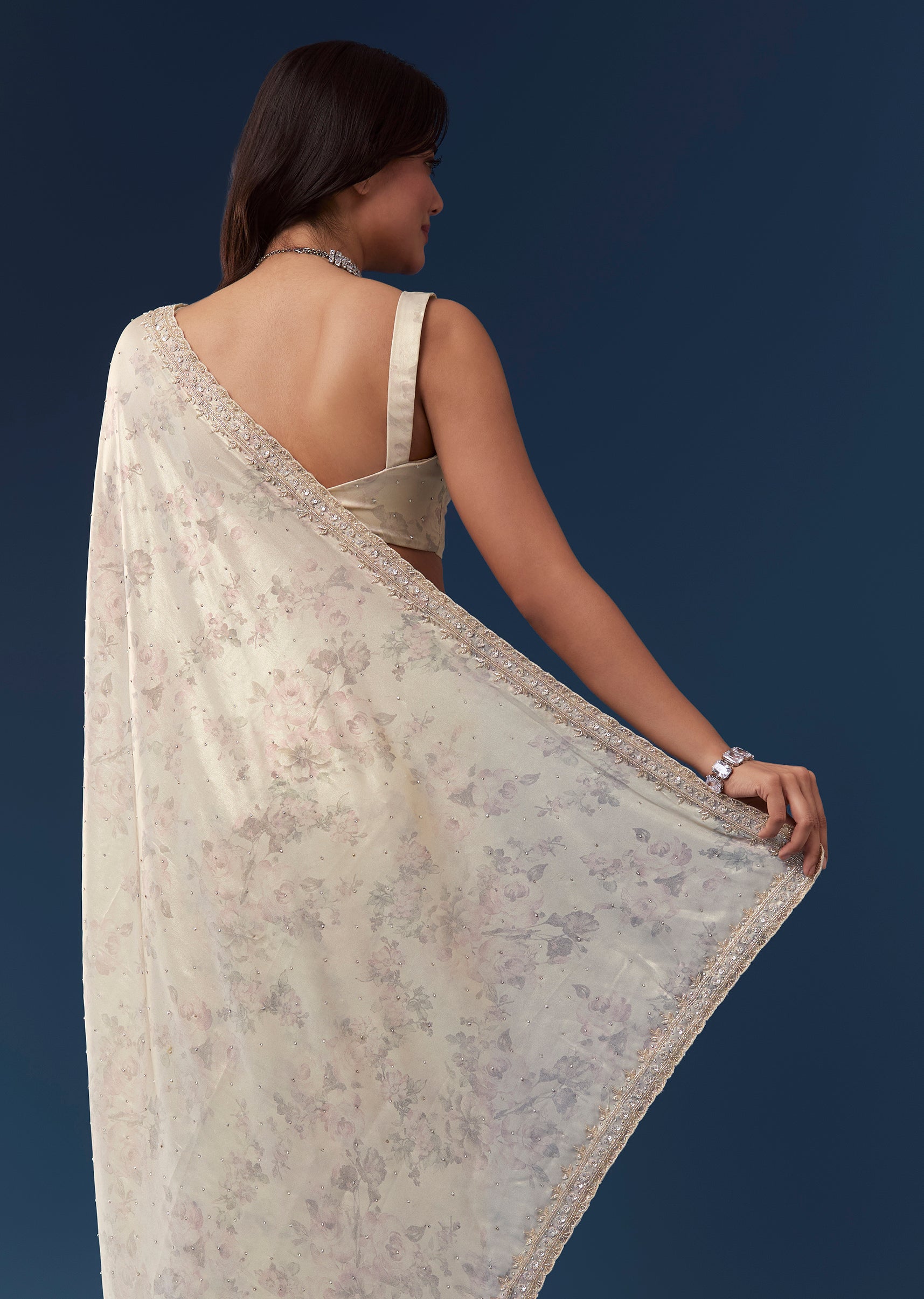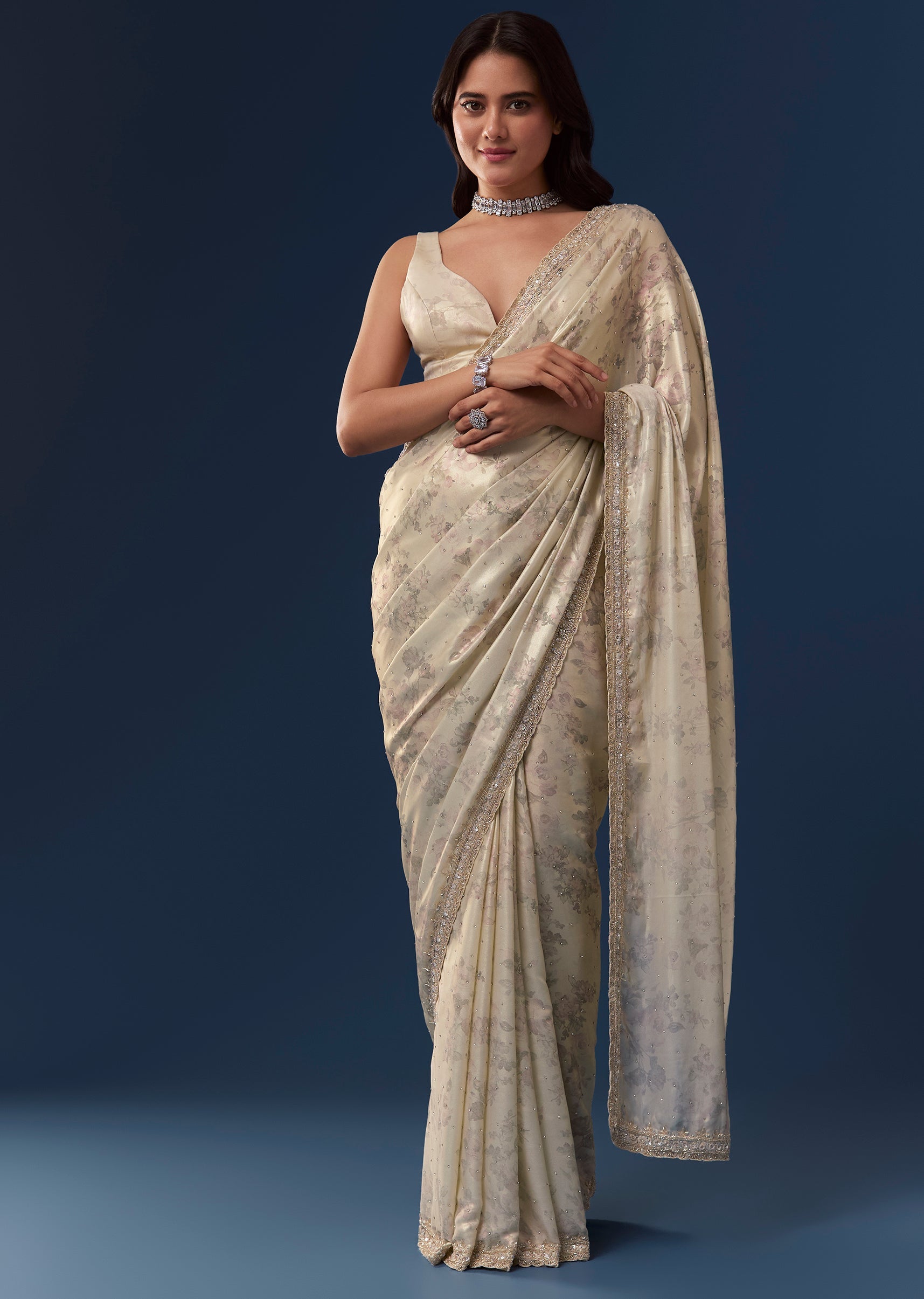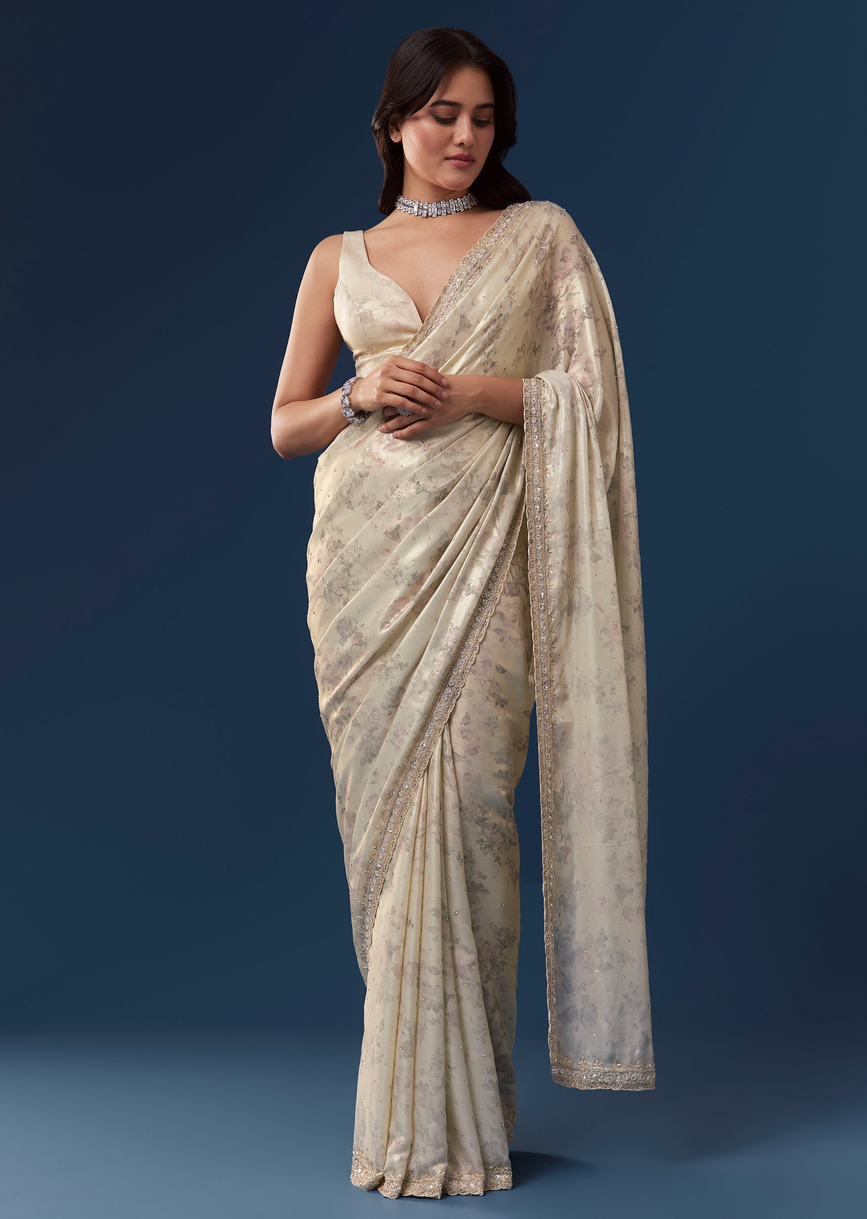 Cream Satin Saree With Purple Floral Print And Embroidered Border