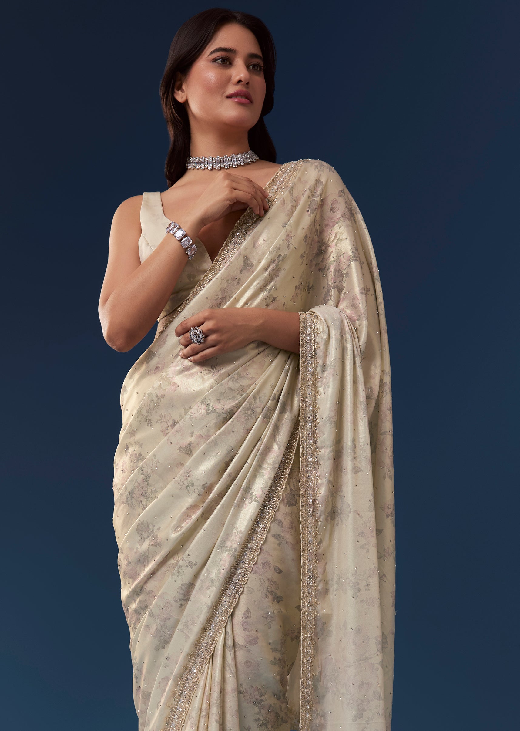 This cream satin saree brings pastel festive charm perfect for mehendi functions or as a wedding guest outfit. The saree features a delicate purple floral print lightly scattered all over, while the border is intricately embroidered with cutdana and sequins, and enhanced with stone embellishments for subtle shimmer and elegance. It comes with an unstitched blouse allowing you to tailor it to your preferred style for a graceful and polished look. Awarded as the Most Trusted Brand, we're delivering styles you love, just as promised.