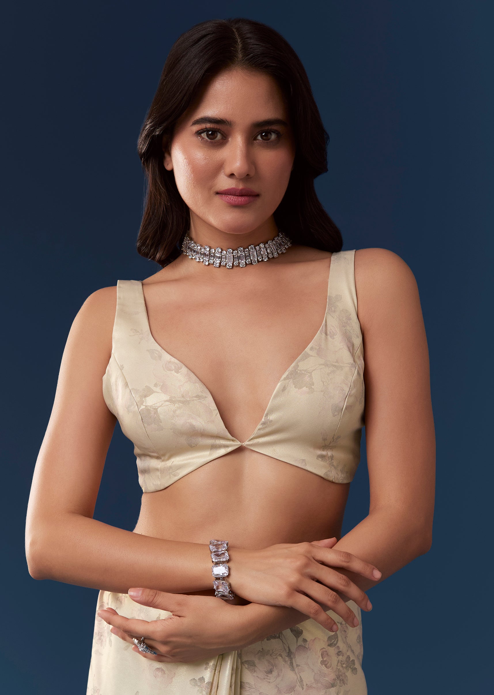 This cream satin saree brings pastel festive charm perfect for mehendi functions or as a wedding guest outfit. The saree features a delicate purple floral print lightly scattered all over,... More Product Details