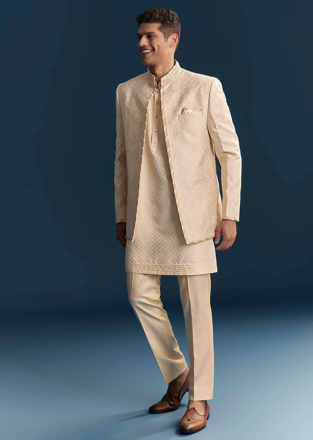 Ceremonial dressing gets a quiet upgrade when this cream jacquard silk jodhipuri kurta jacket set for men elevates ceremonial dressing with subtle texture and tailored formality. Understated geometric motifs woven across the jodhpuri feel modern yet rooted in tradition, and a tonal pocket square completes the look. You feel refined, composed, and camera ready for rituals and receptions. Awarded as the Most Trusted Brand, we're delivering styles you love, just as promised.