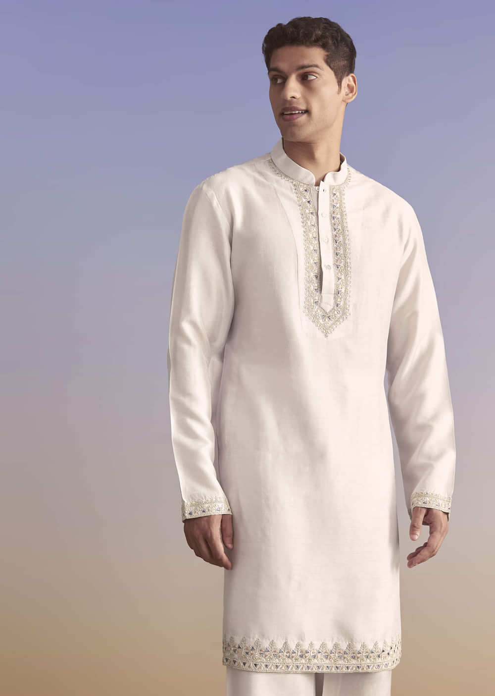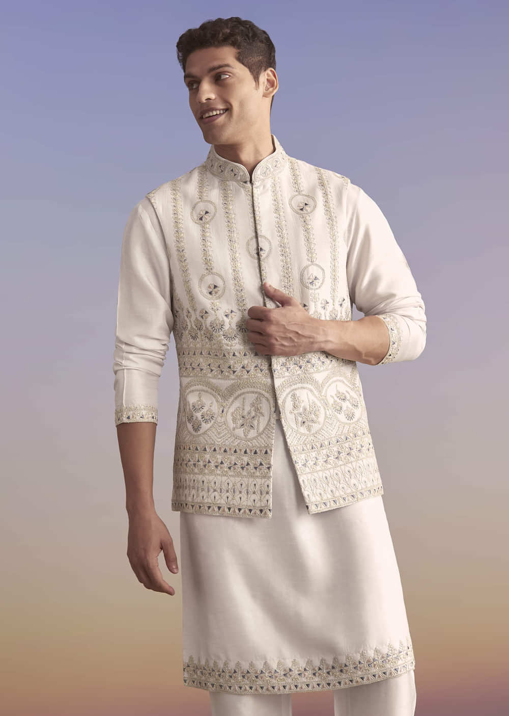 Fit Tips:The jacket rests clean on the shoulders and closes flat, while the kurta underneath falls straight with easy room at the elbows.