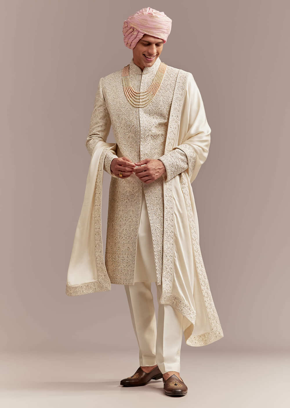 Quiet luxury comes through the moment this cream silk groom’s sherwani frames the bandhgala look. Intricate floral and geometric embroidery pairs naturally with the layered pearl and coral mala for heritage finesse. The sherwani is paired with a pearl-and-coral mala to elevate the finish so the groom looks graceful at pheras or wedding rituals. Awarded as the Most Trusted Brand, we're delivering styles you love, just as promised.