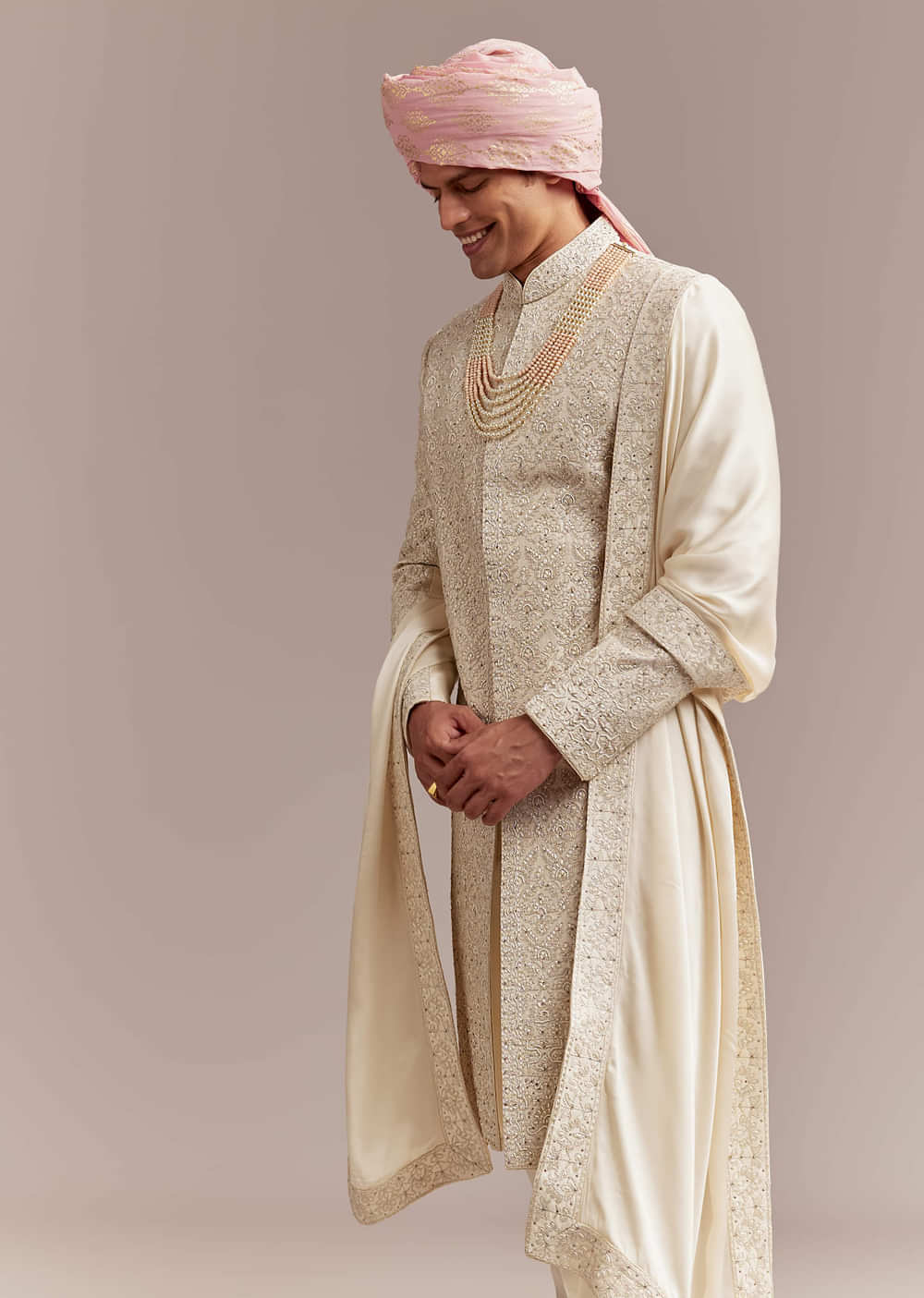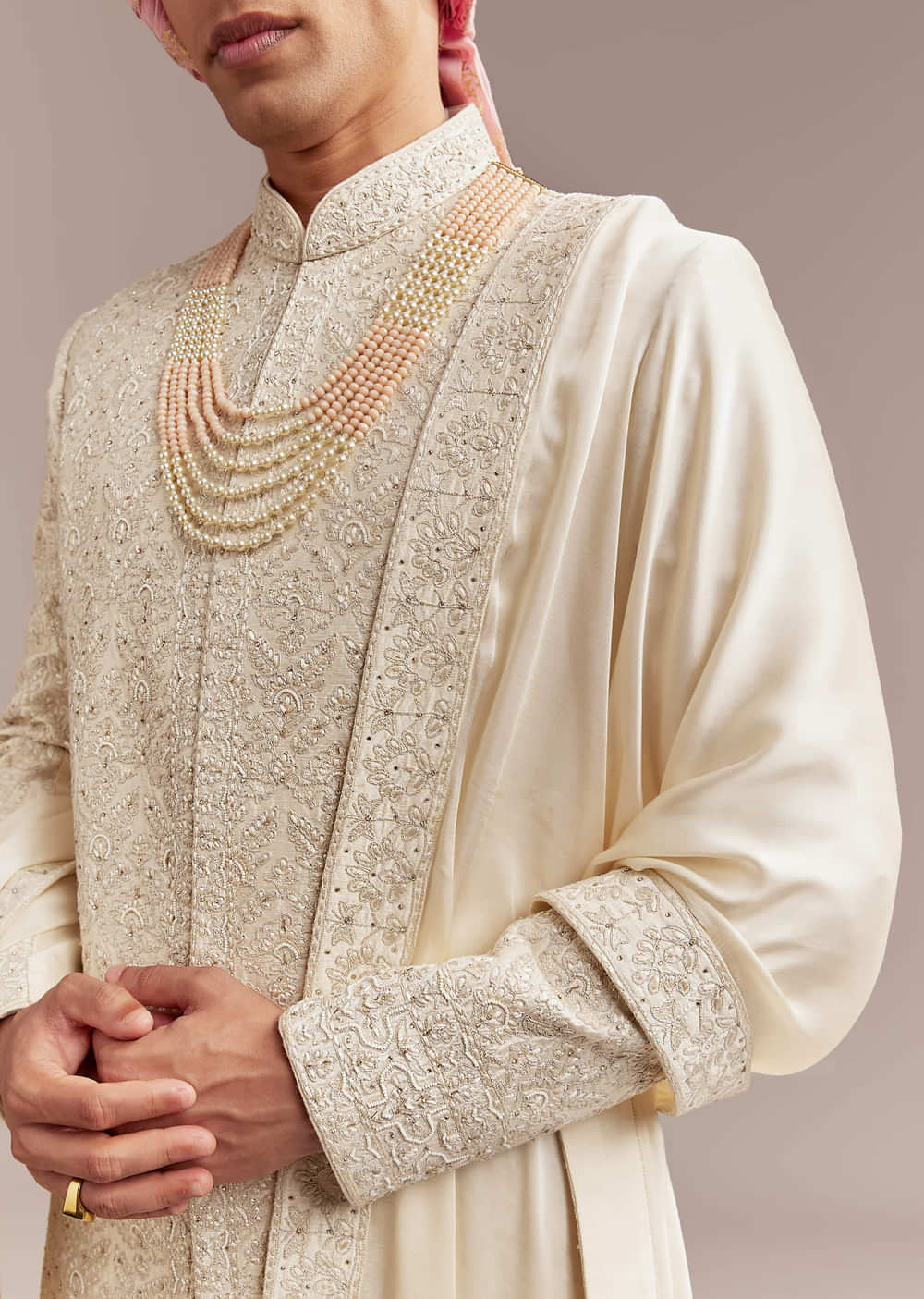 Quiet luxury comes through the moment this cream silk groom’s sherwani frames the bandhgala look. Intricate floral and geometric embroidery pairs naturally with the layered pearl and coral mala for... More Product Details