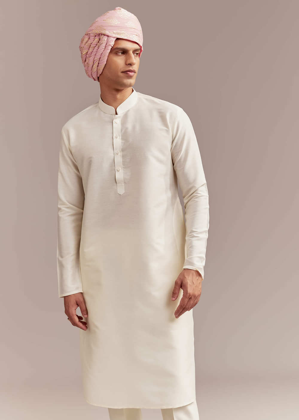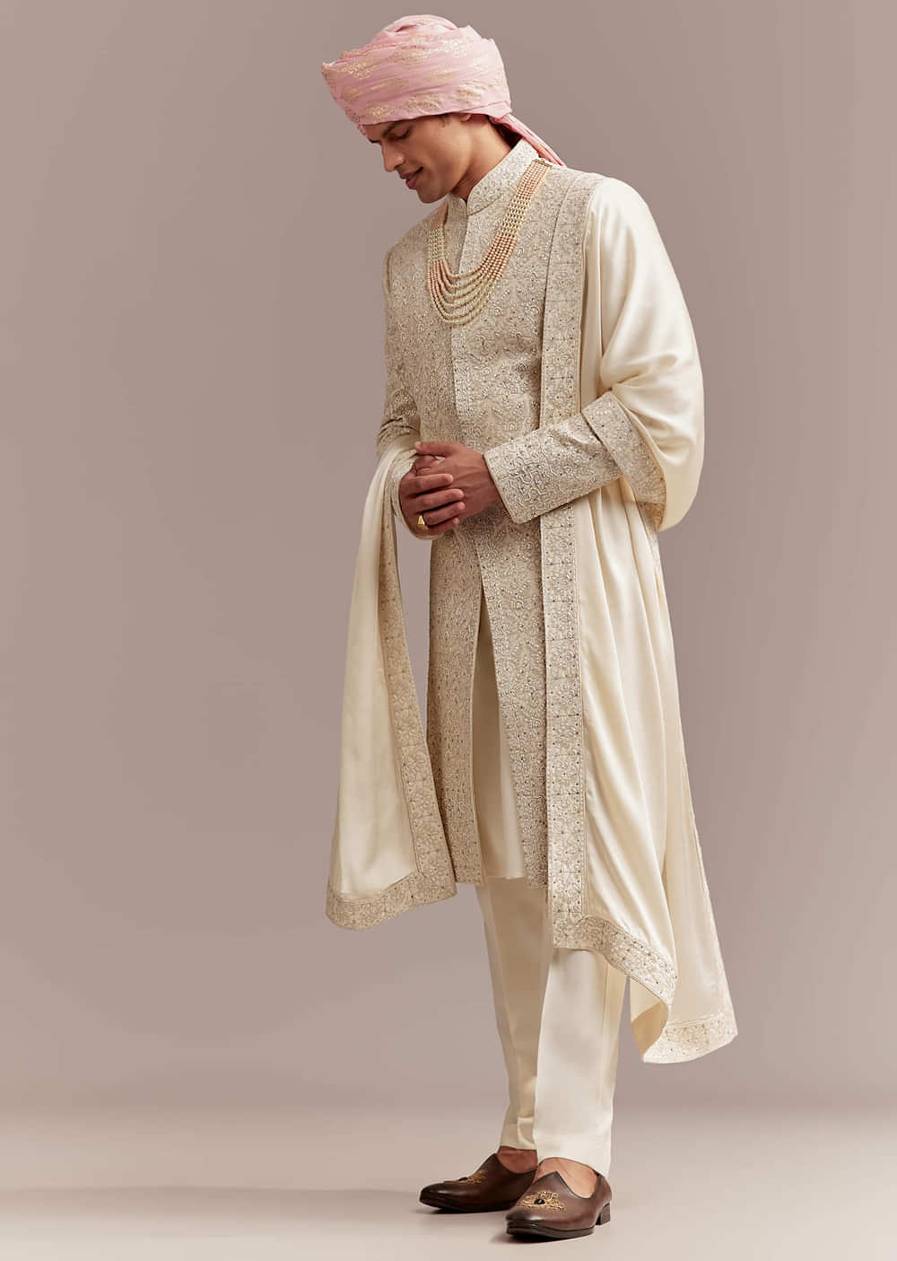 Fit Tips:The sherwani should feel structured at the collar and chest, while allowing free movement for long wedding hours.