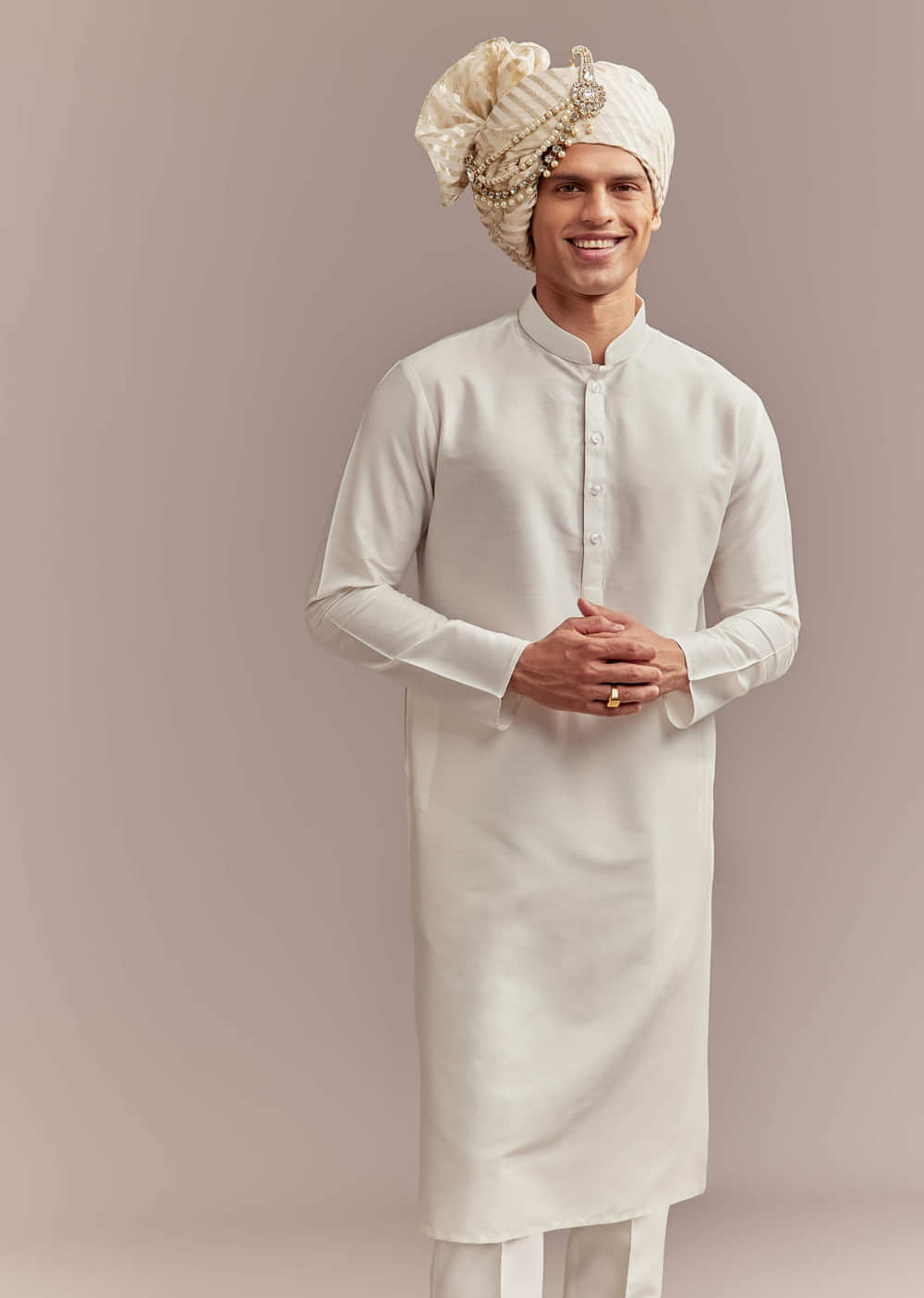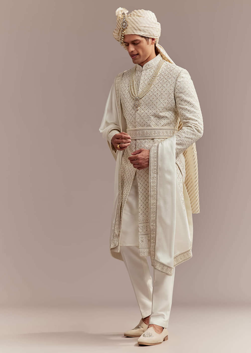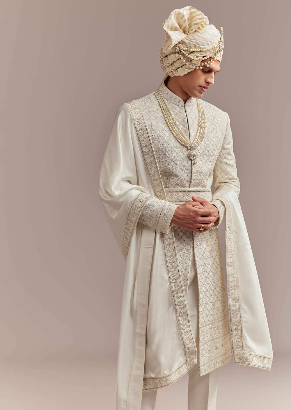 Cream Silk Sherwani For Groom With Mughal Inspired Motifs
