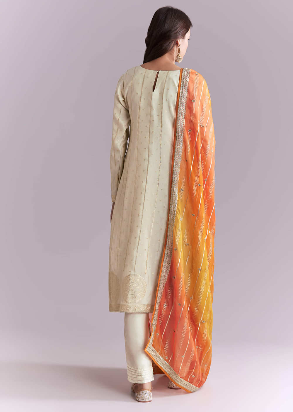 Cream Tissue Kurta Set With Embroidery And Two Tone Dupatta