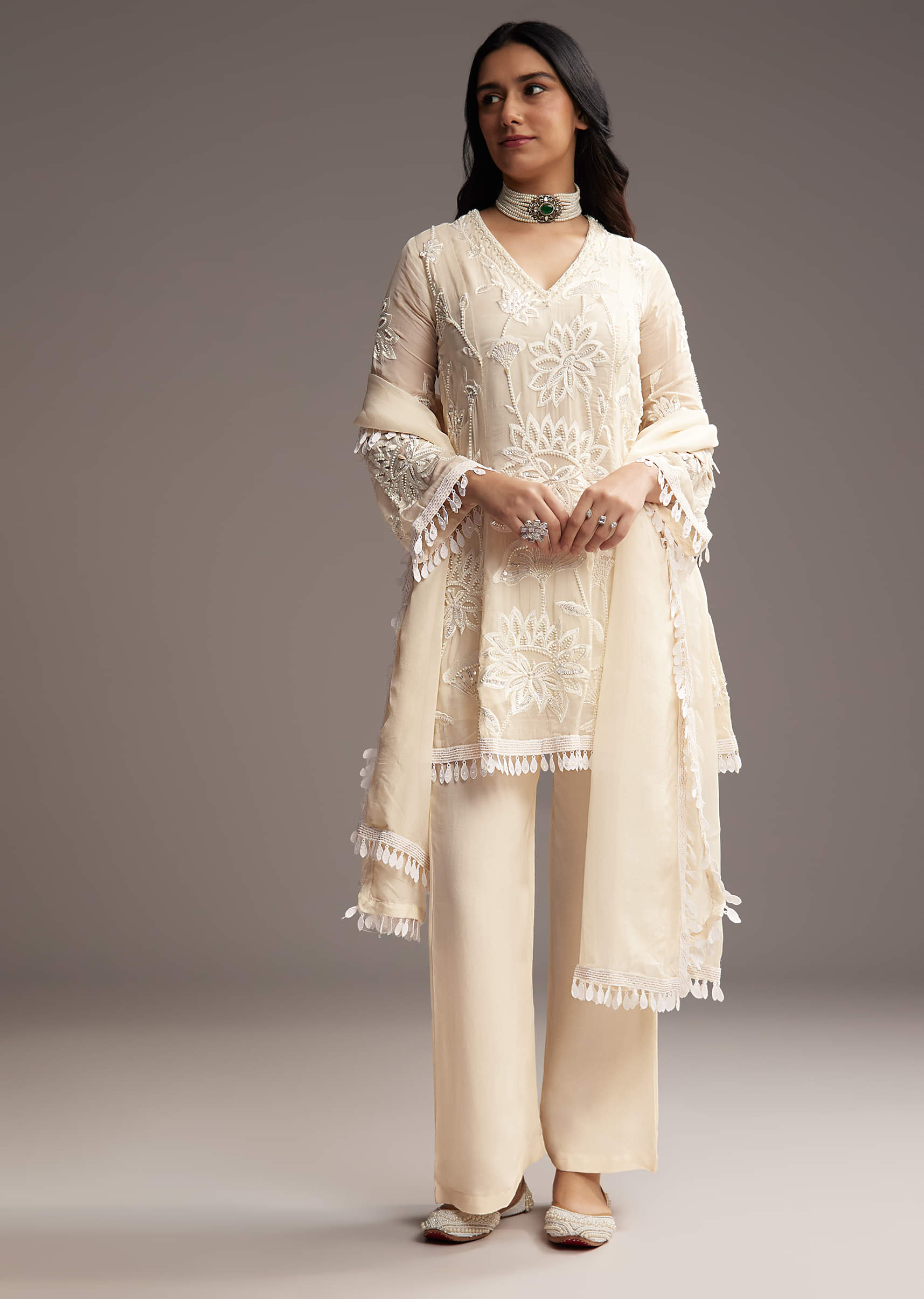A canvas of quiet charm, this cream white organza kurta set brings together minimalism and celebration with its soft resham embroidery. It carries the kind of purity and poise that... More Product Details