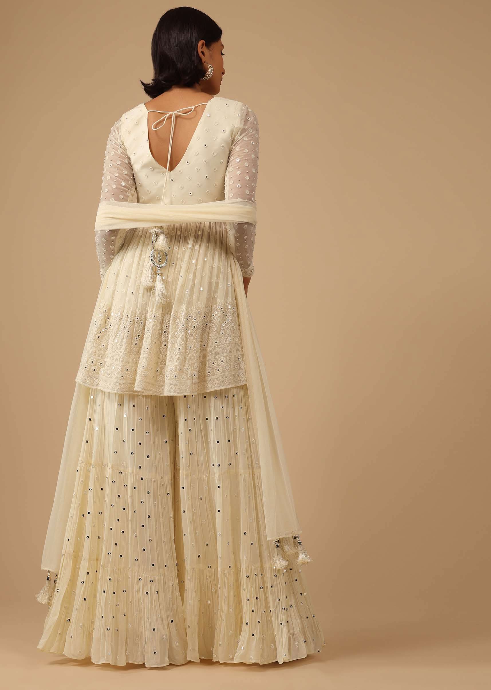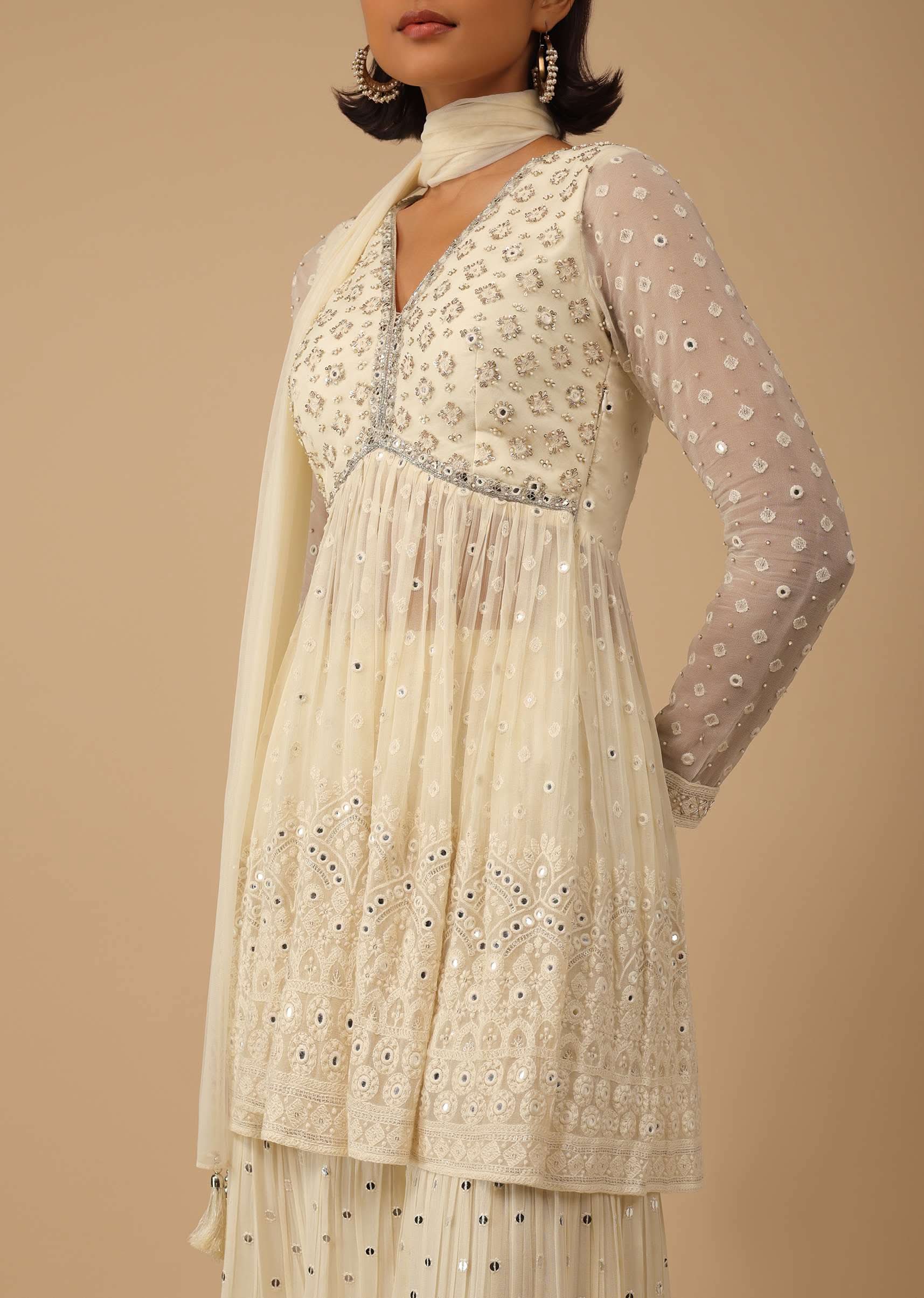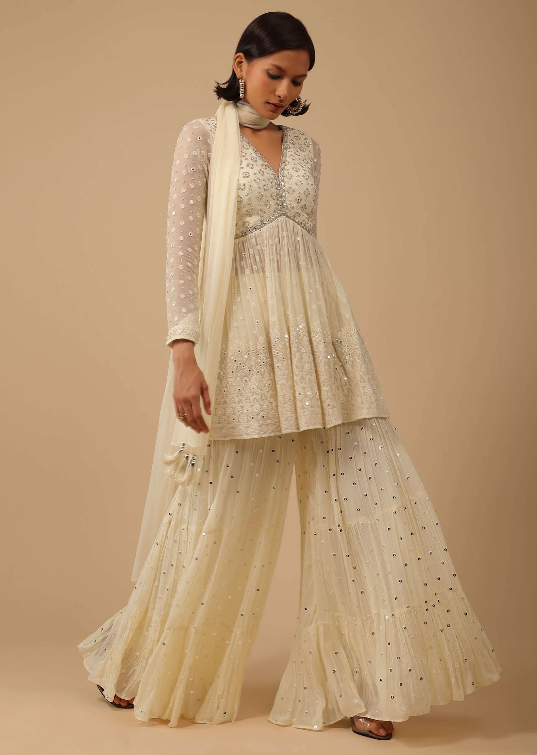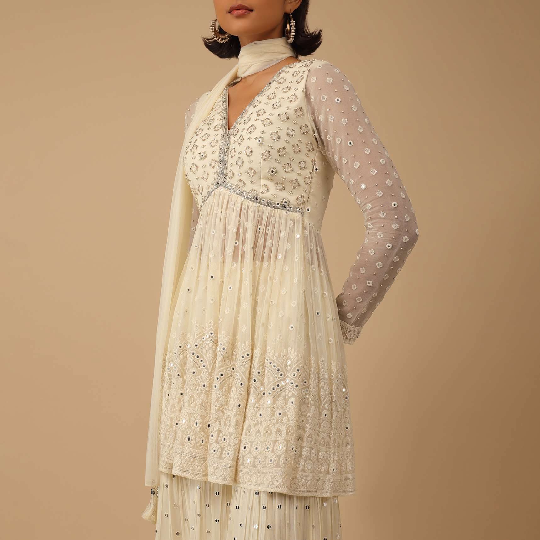 Cream White Sharara Suit Set In Georgette With Lucknowi Embroidery