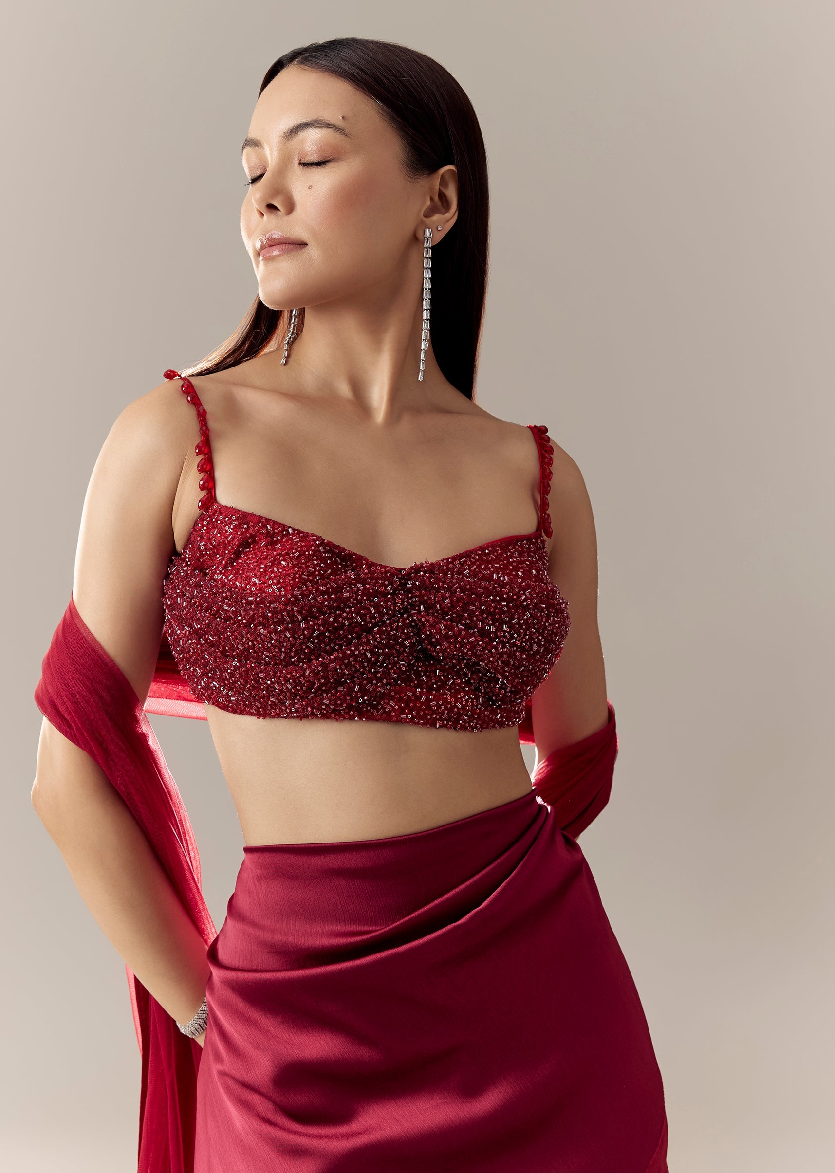 A Milano fancy blouse with a statement neckline, noodle straps, cowl-style drape, and cut-dana work—made to elevate plain sarees/lehengas. Awarded as the Most Trusted Brand, we're delivering styles you love, just as promised.
