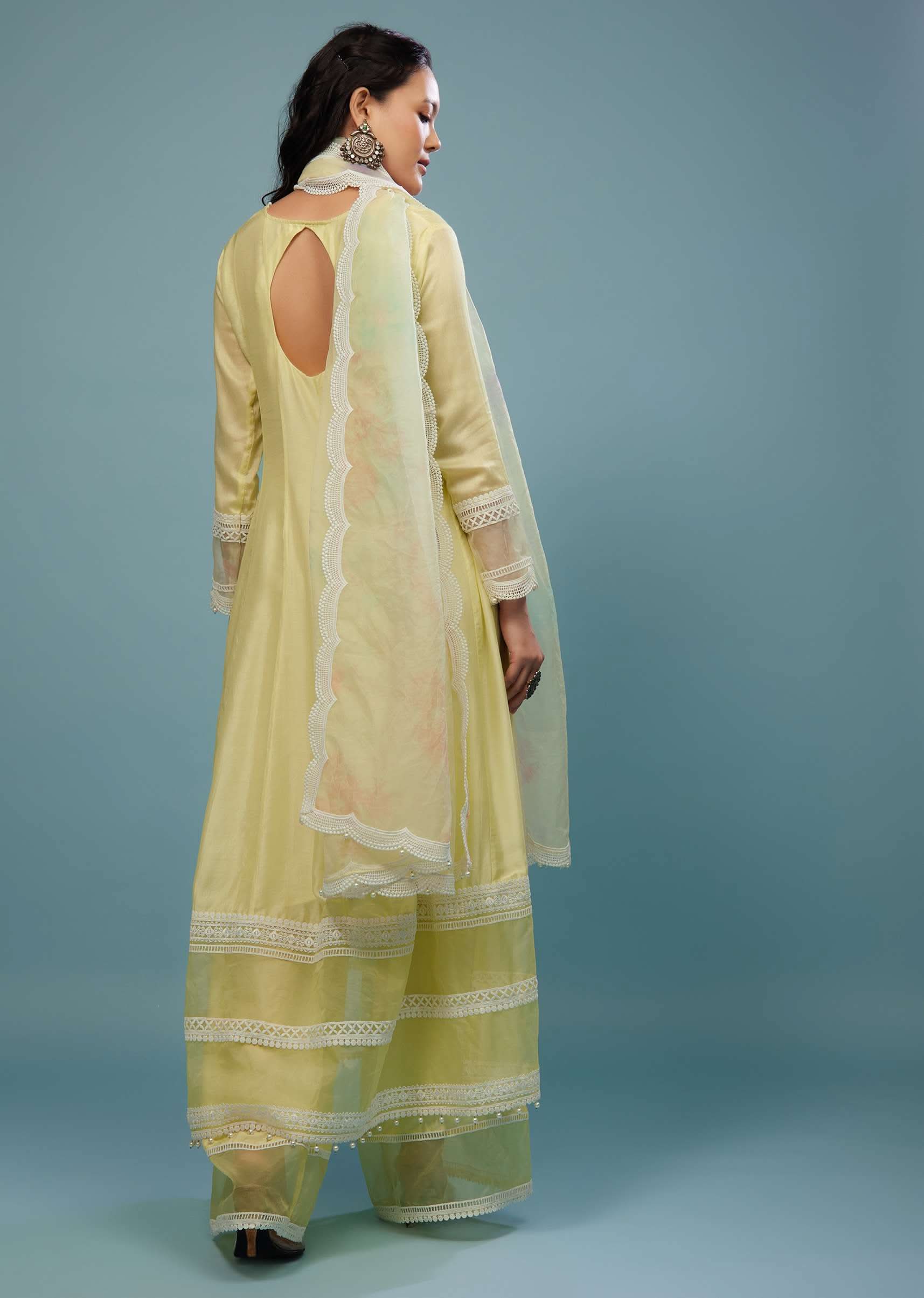 • The outfit is fabricated in a viscose silk kurta, tussar silk palazzo, and an organza dupatta.