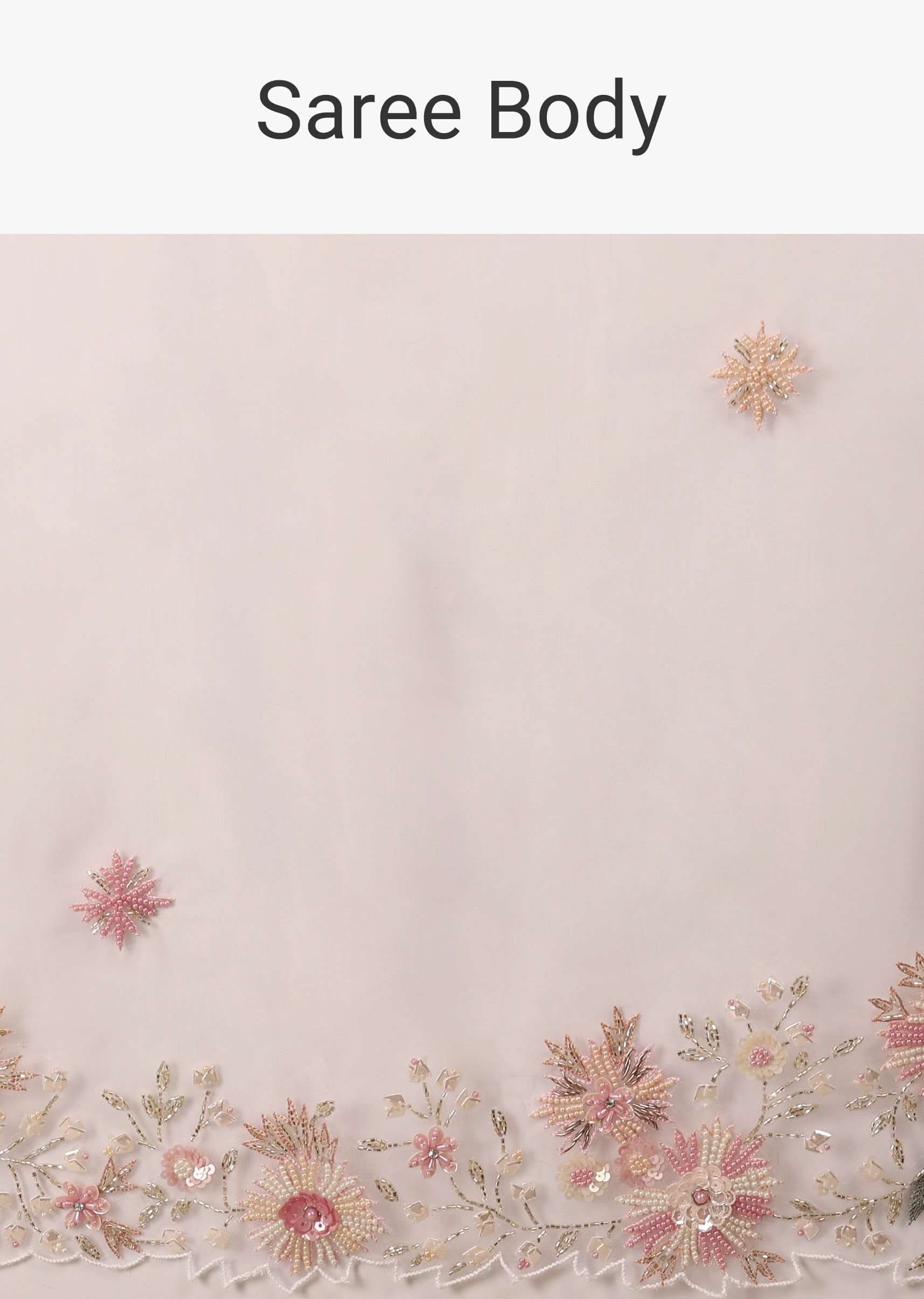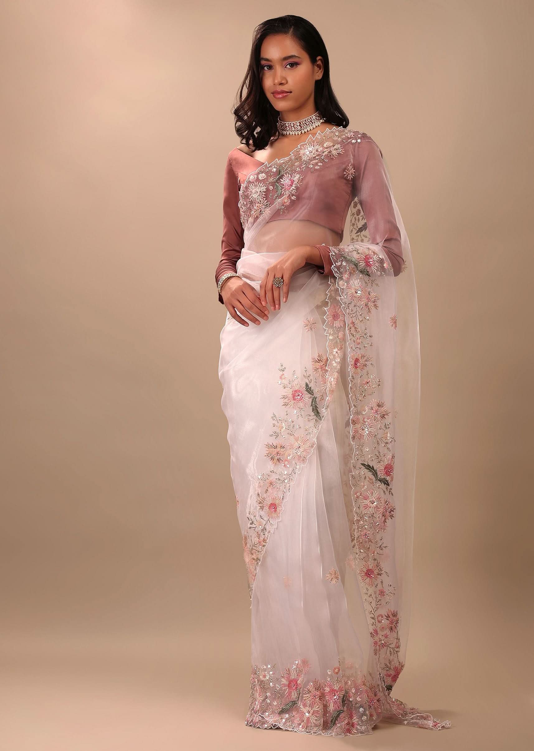 -  The saree is fabricated in white organza with floral embroidery in pink.