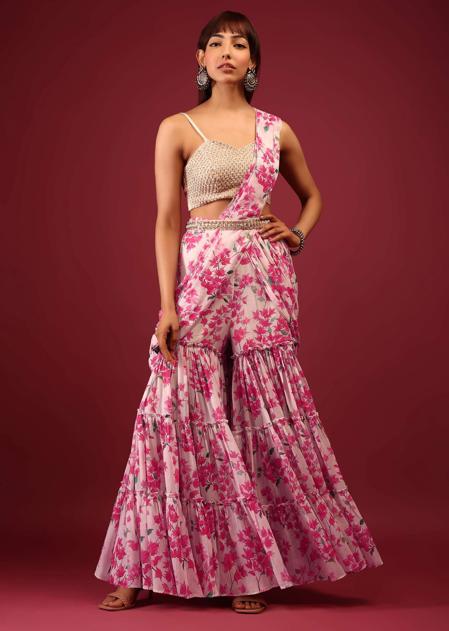 - Star White floral print pre-pleated sharara saree with an attached pallu.