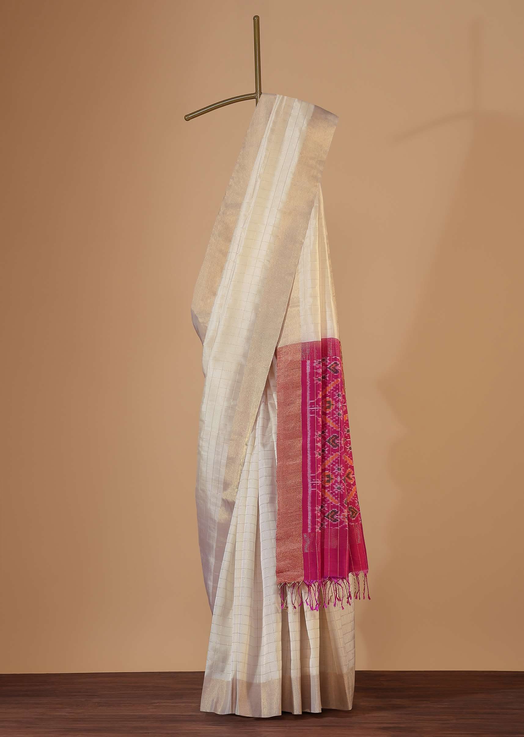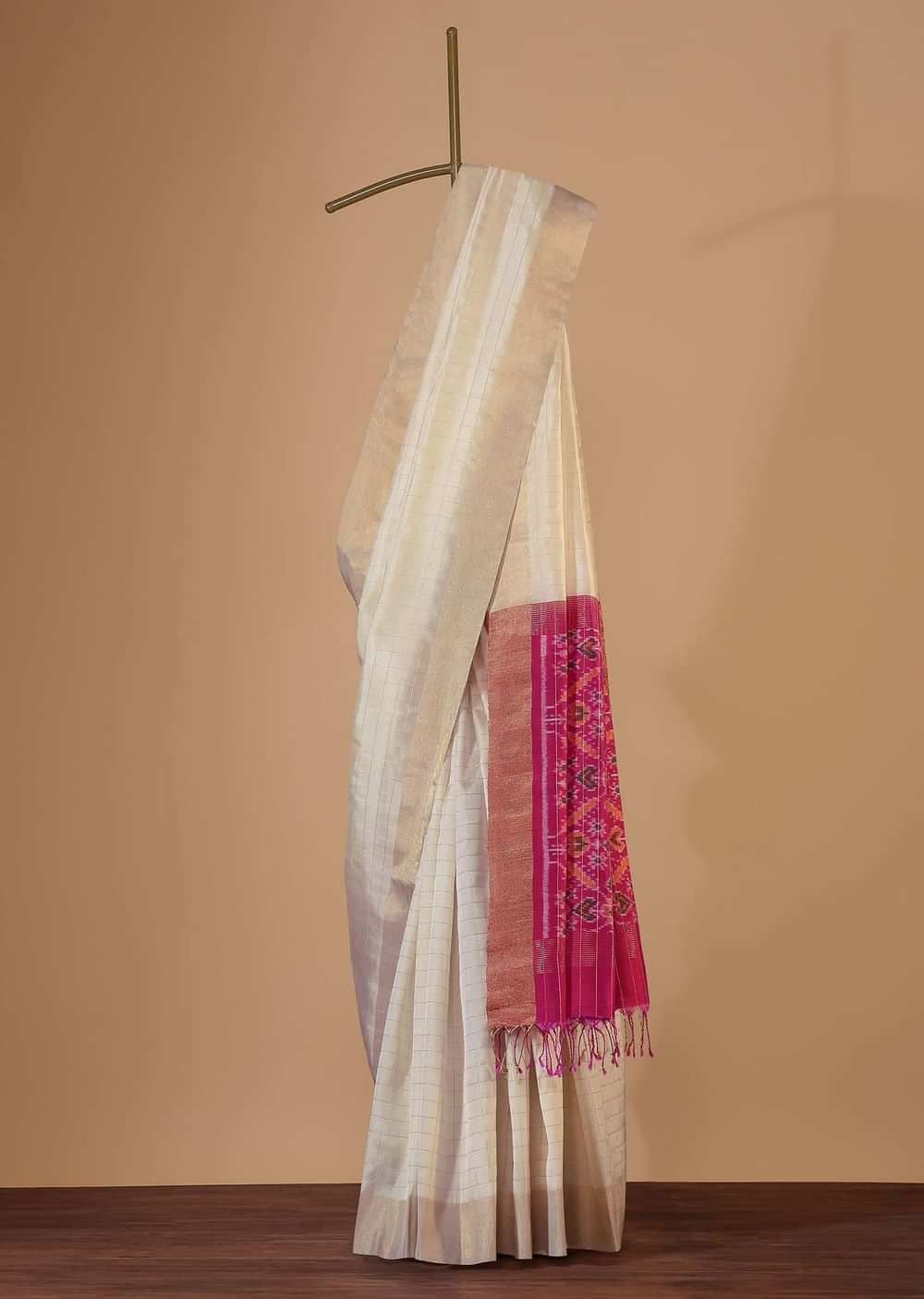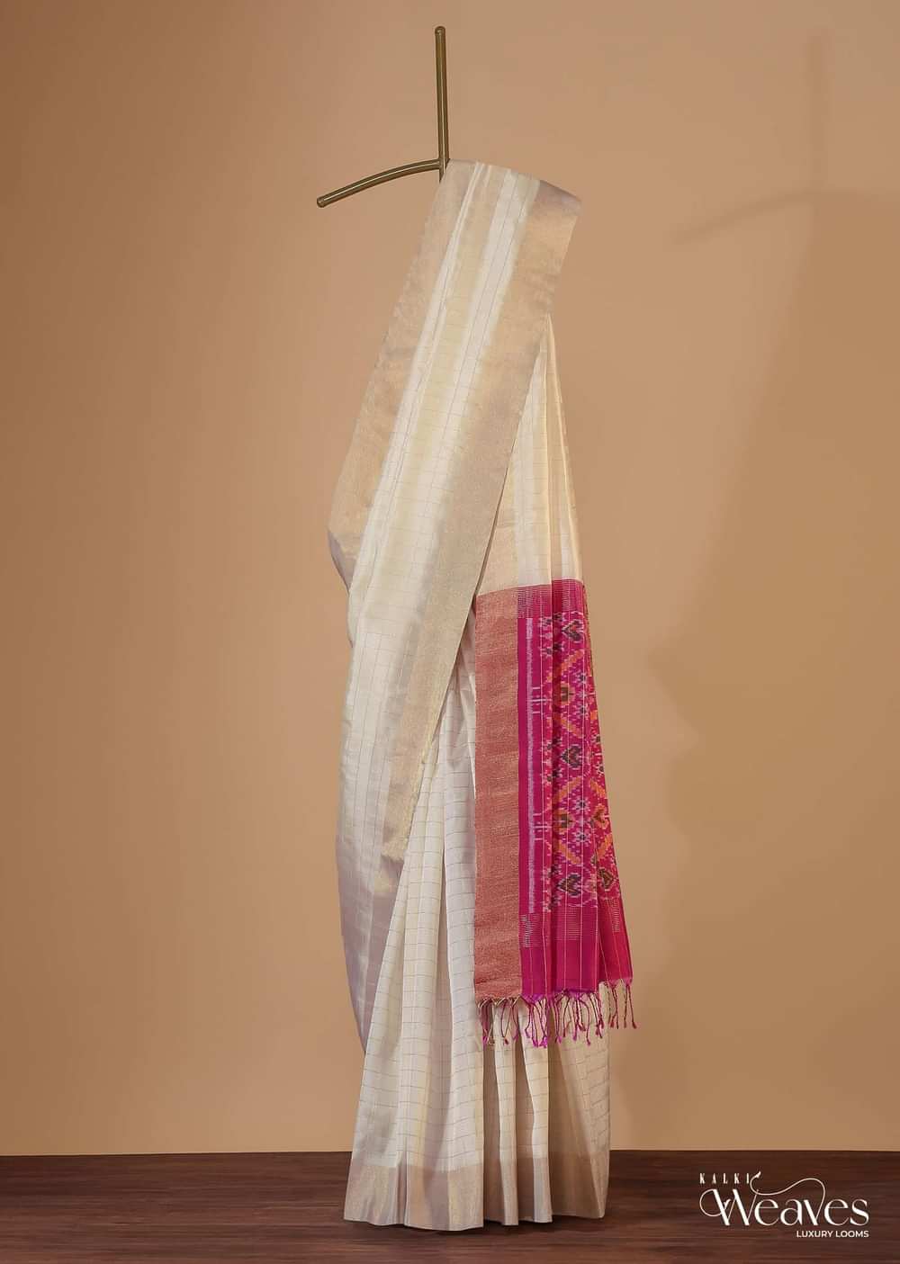 Daisy White Handloom Saree In Album South Silk With Ikat Patola Pallu And Unstitched Blouse