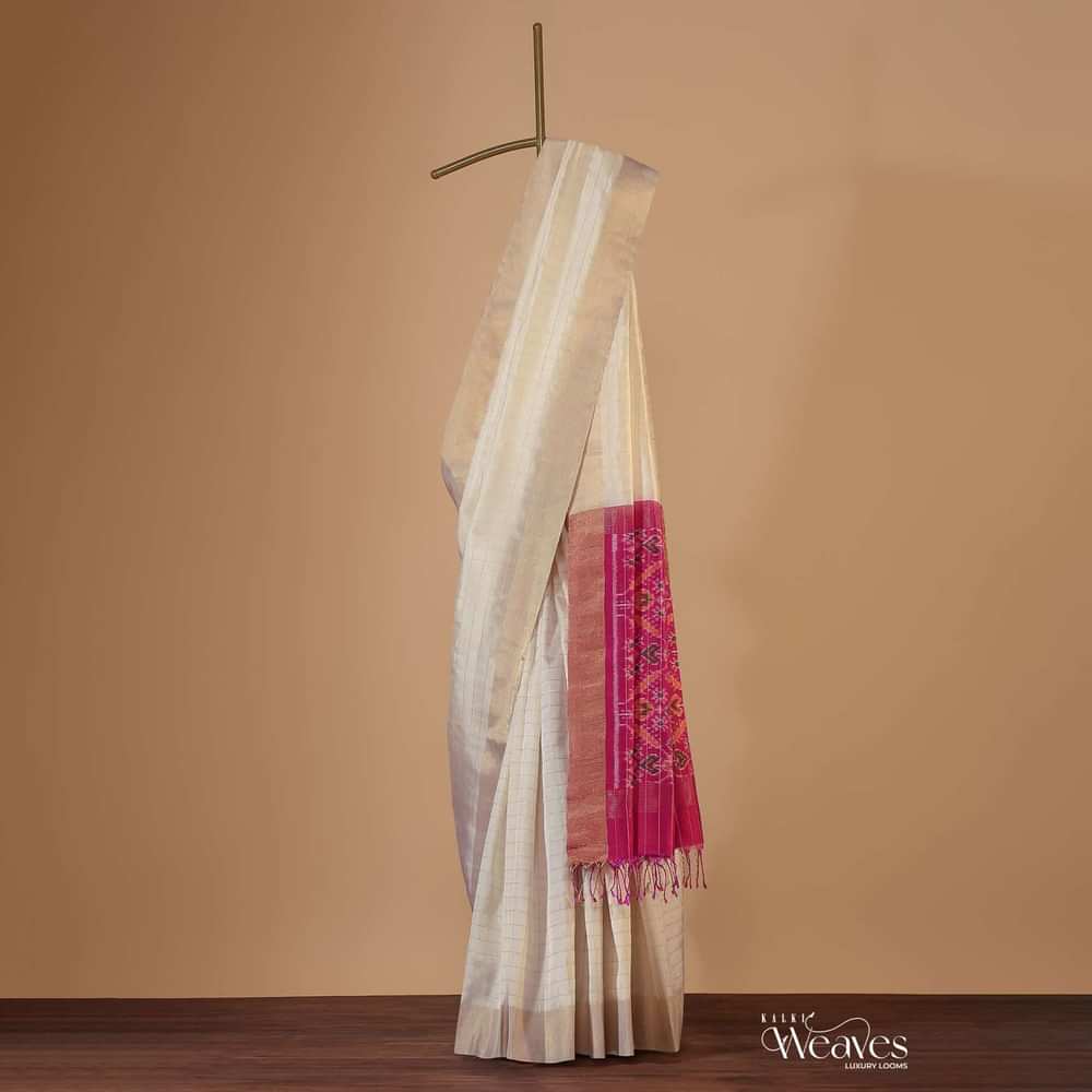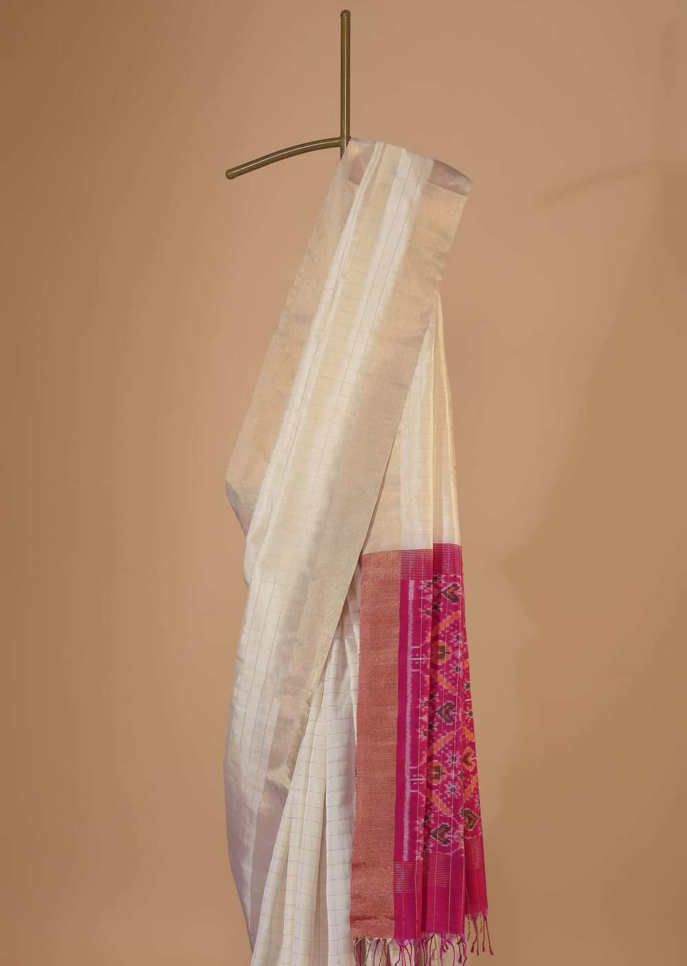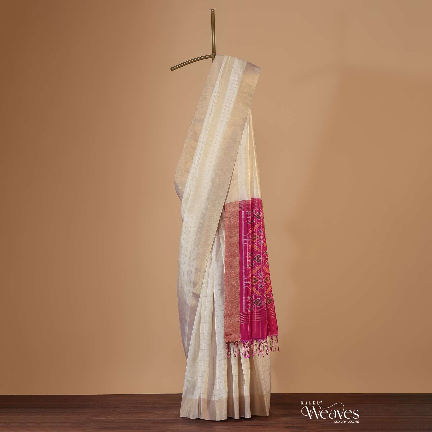 Daisy White Handloom Saree In Album South Silk With Ikat Patola Pallu And Unstitched Blouse