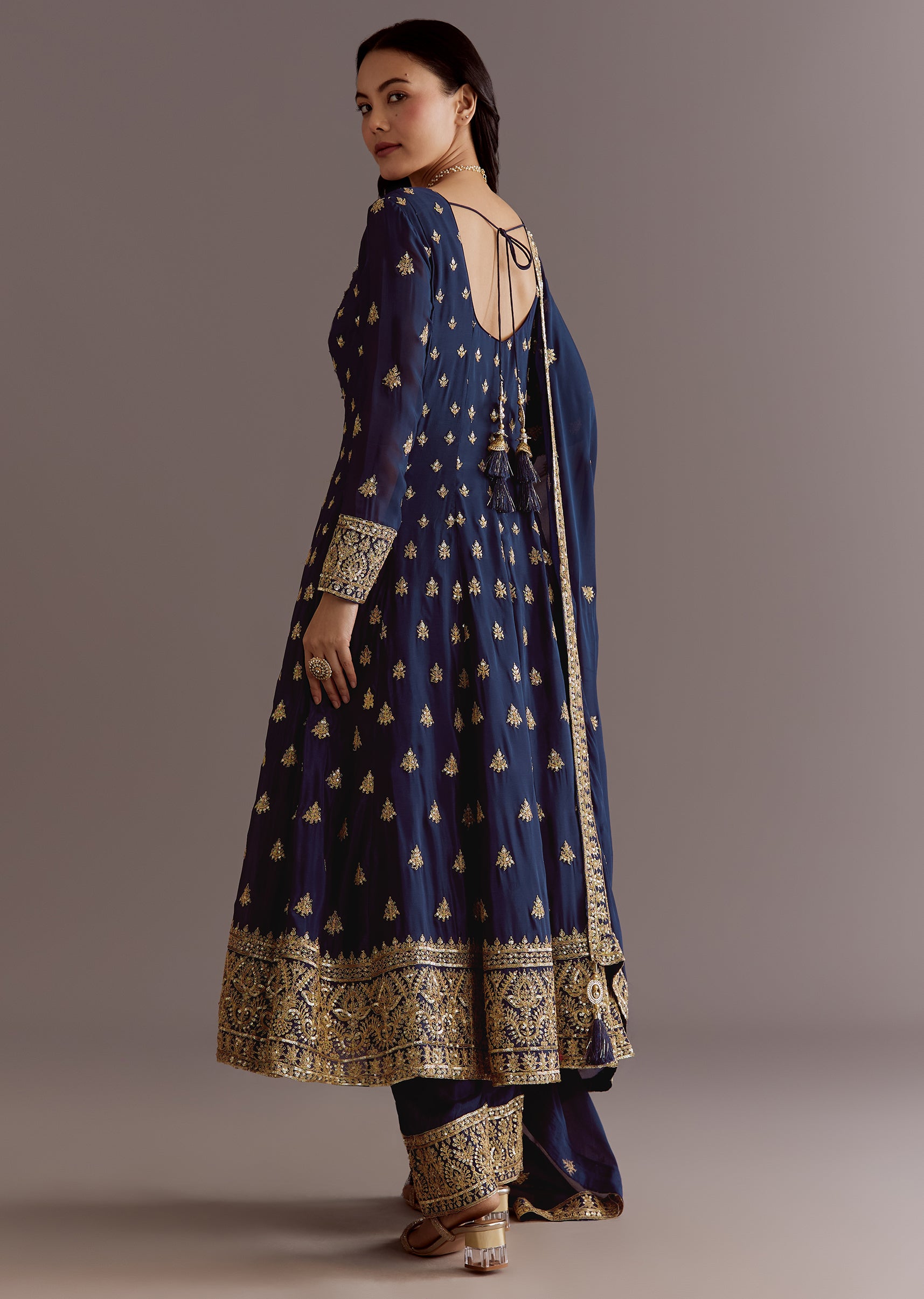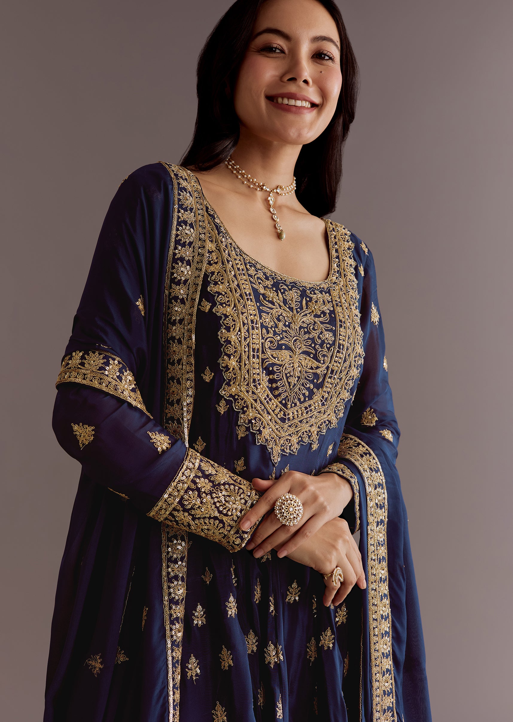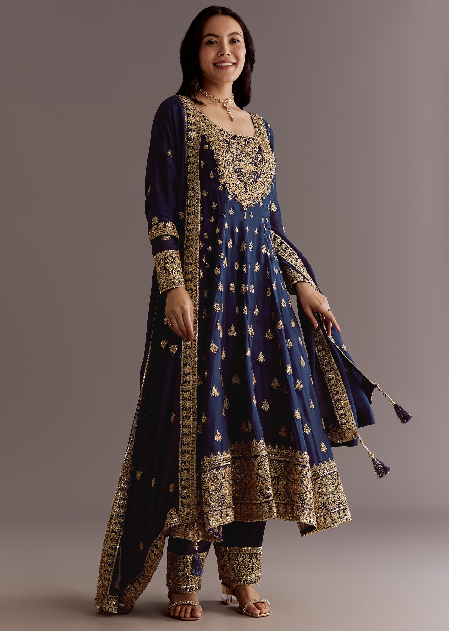 Dark Blue Chinon Zari Embroidered Anarkali Suit With Dupatta