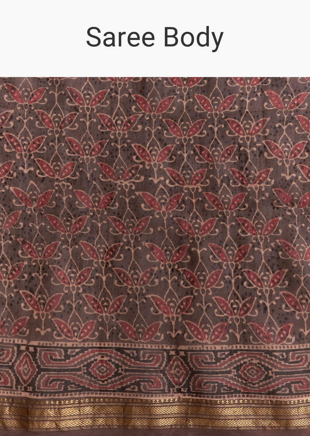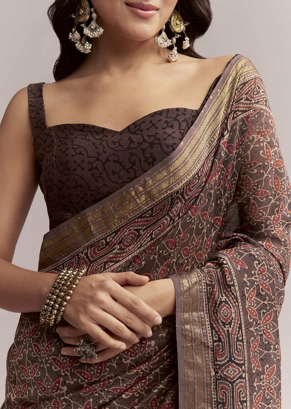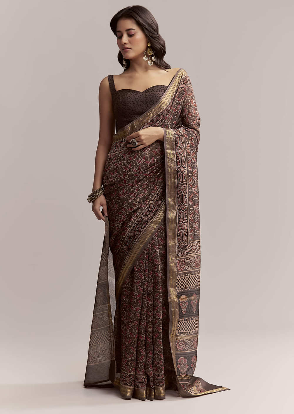 Dark Brown Linen Printed Saree With Authentic Ajrakh Print