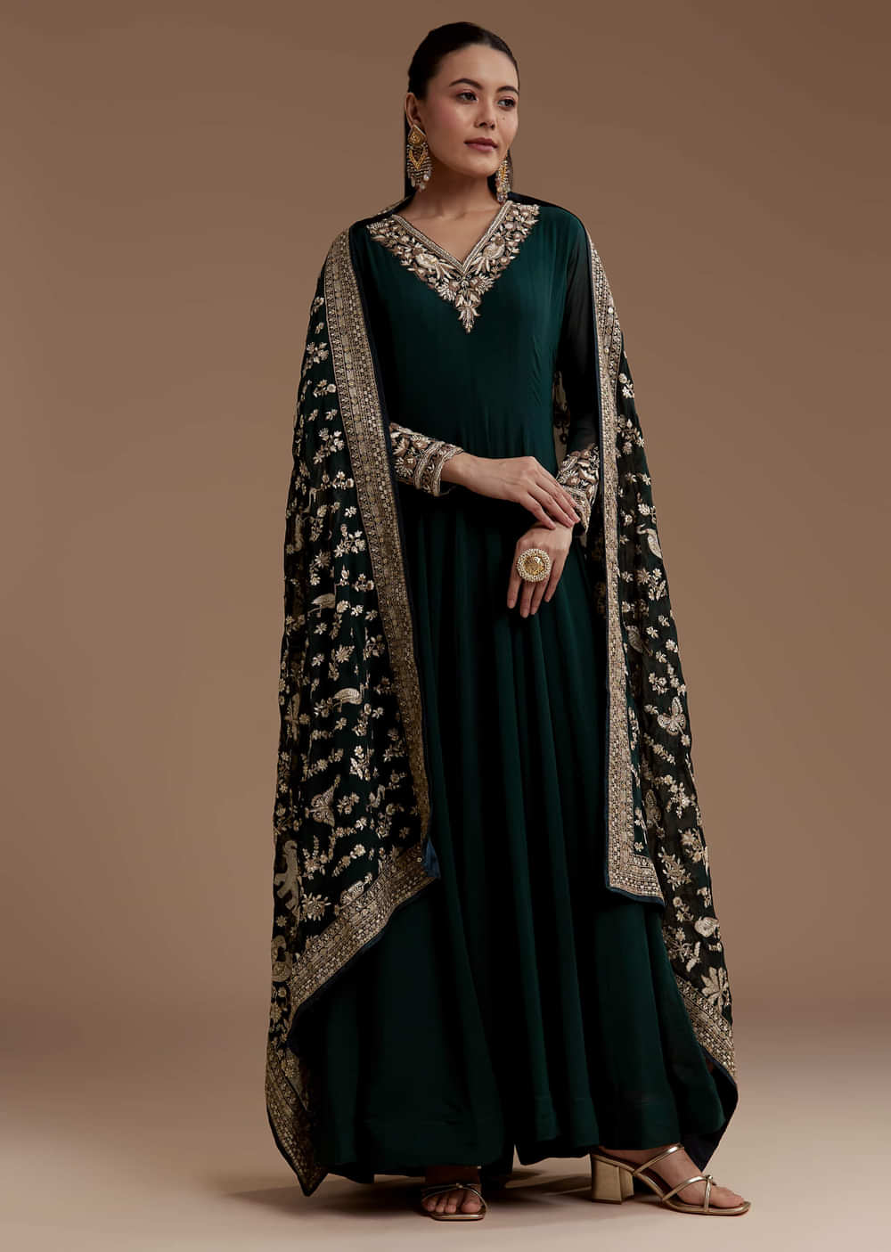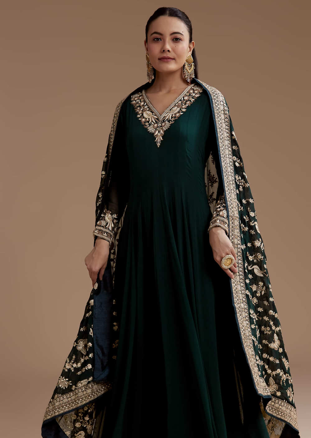 For a regal look with subtle allure, this dark green anarkali suit echoes timeless sophistication. Featuring glistening sequins and thread embroidery on the V-neckline and cuffs, the soft flare moves... More Product Details