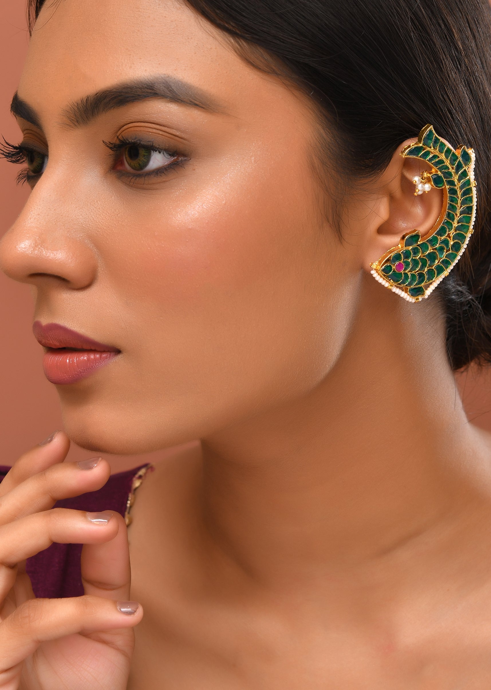 These dark green and gold earrings feature intricate pachi kundan work for a festive and elegant appeal. Perfect for cocktail parties and wedding celebrations, they add sophistication and charm to... More Product Details