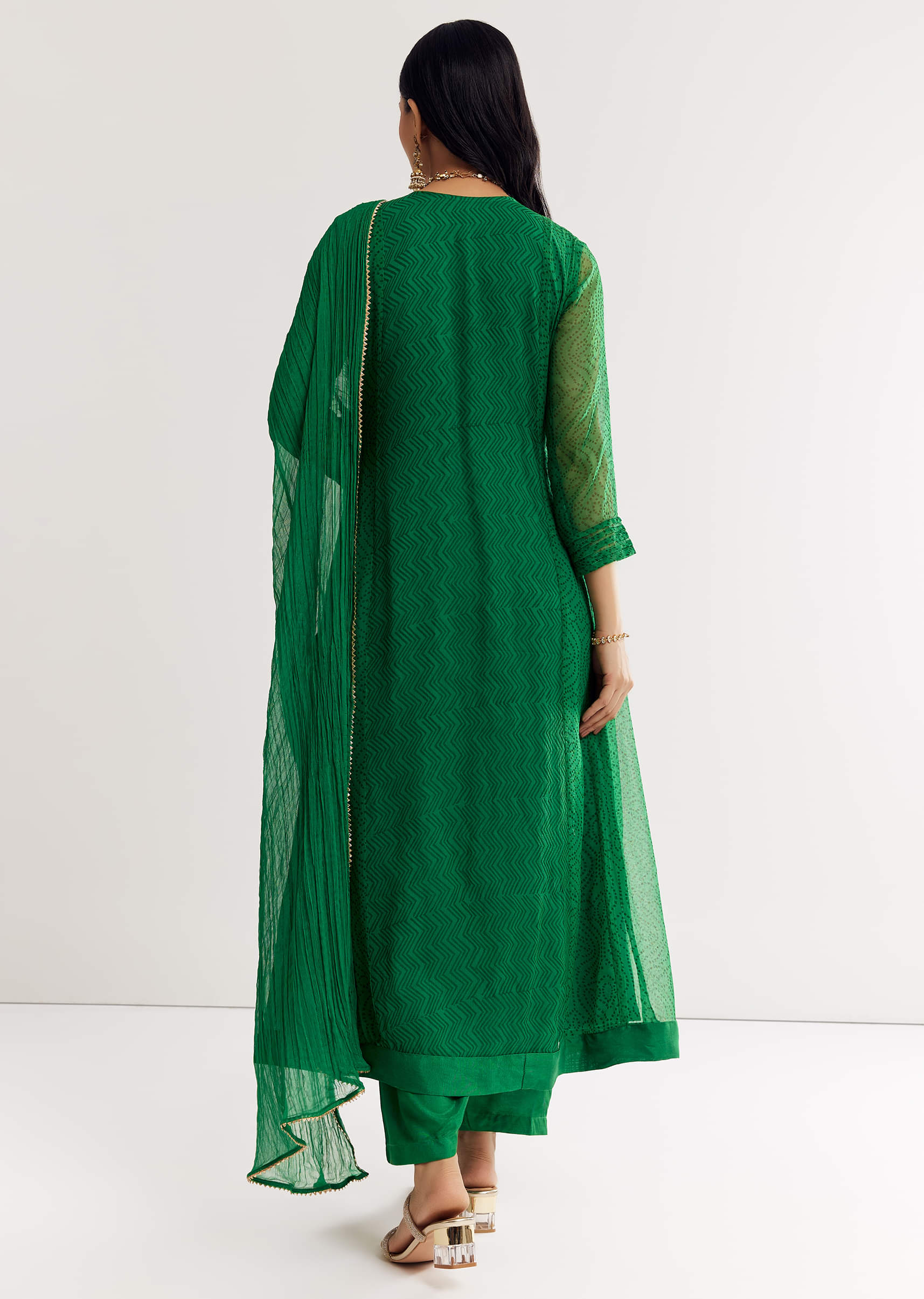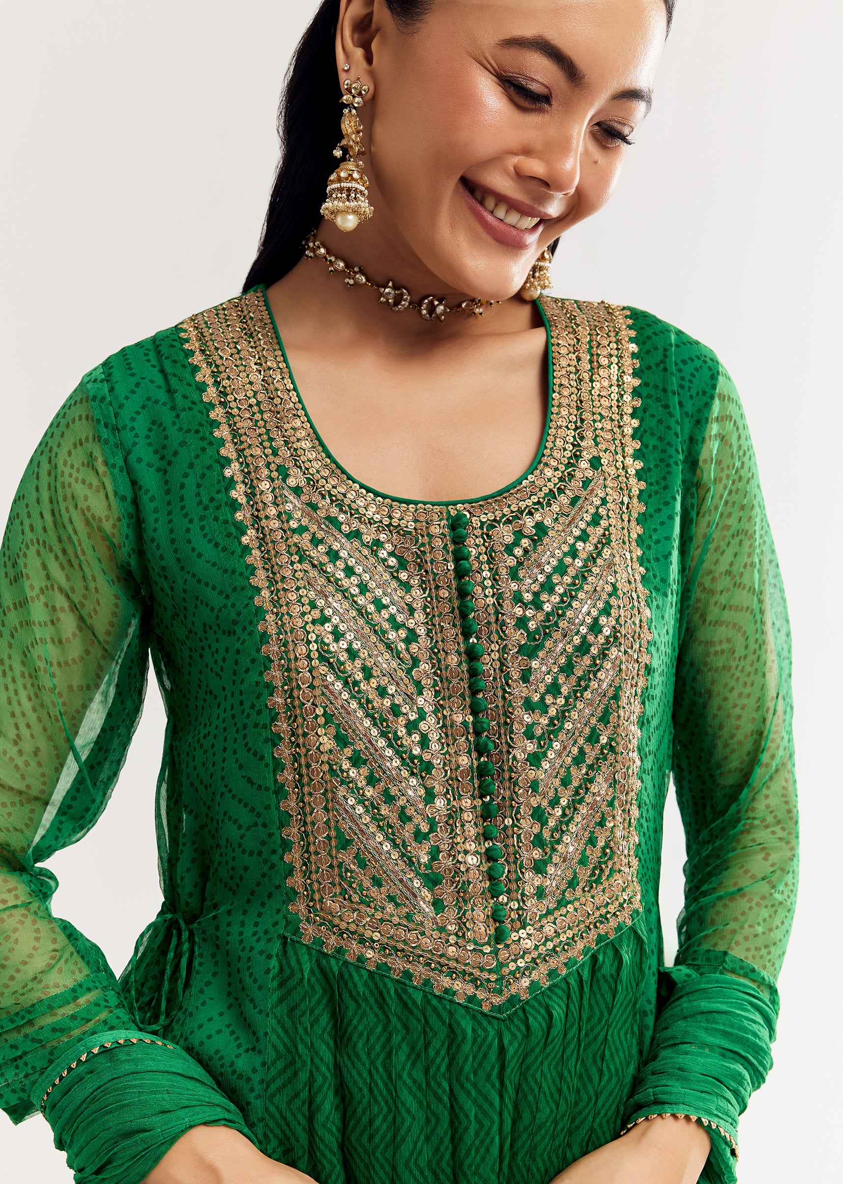 Dark Green Printed Chiffon Sequin Kurta Set With Dupatta