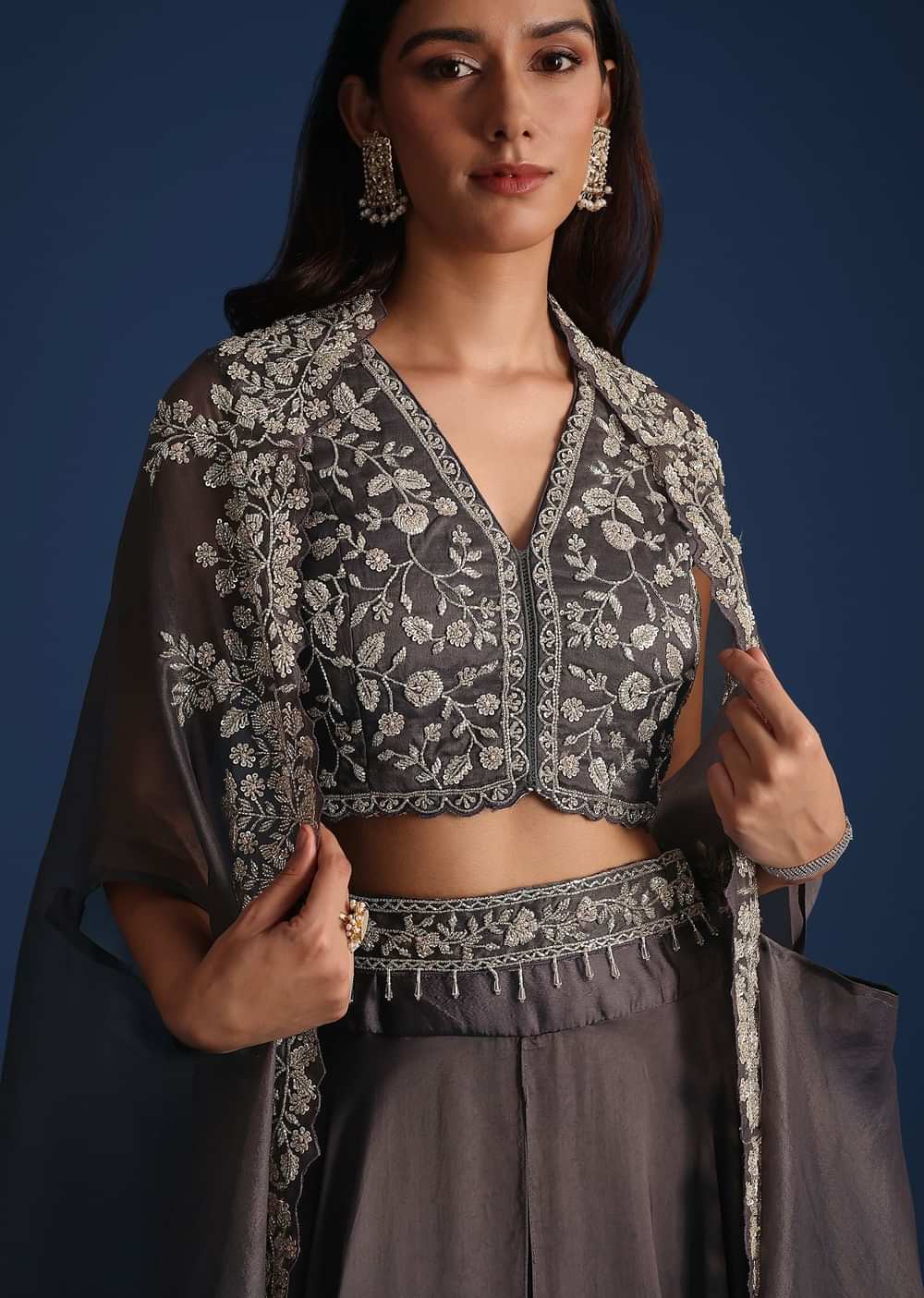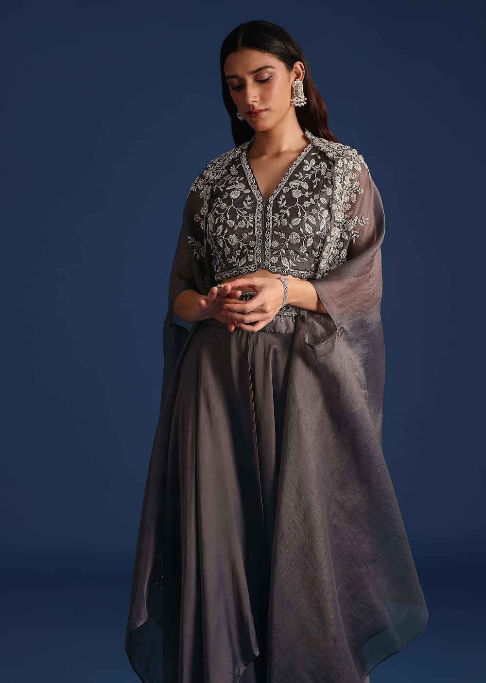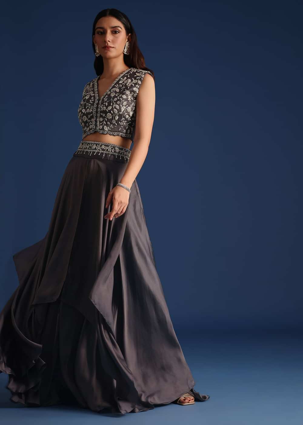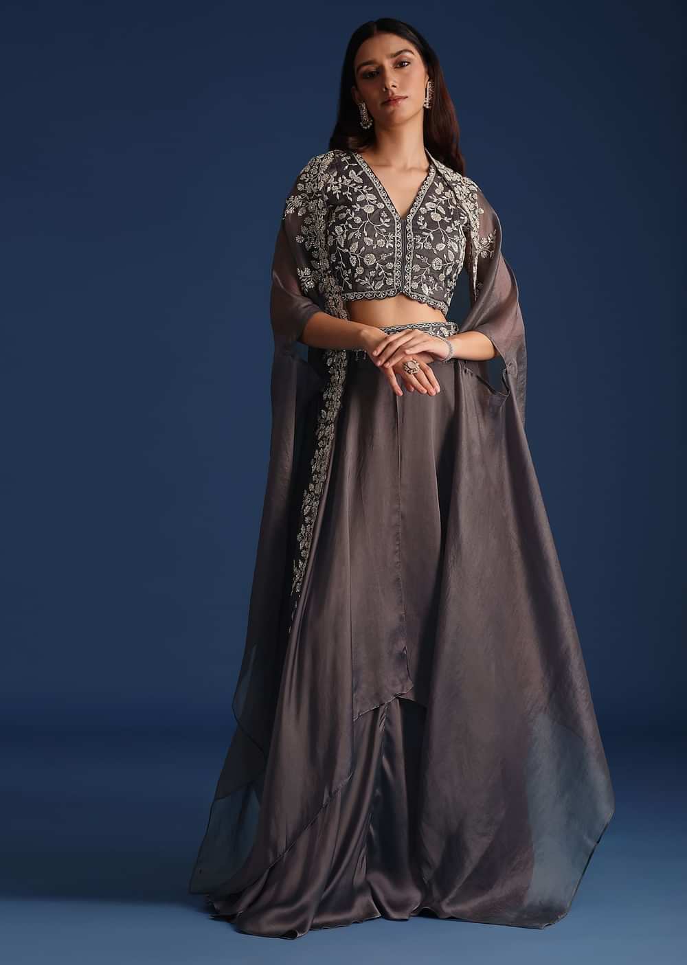 Dark Grey Asymmetric Organza Jacket With Crop Top And Draped Skirt