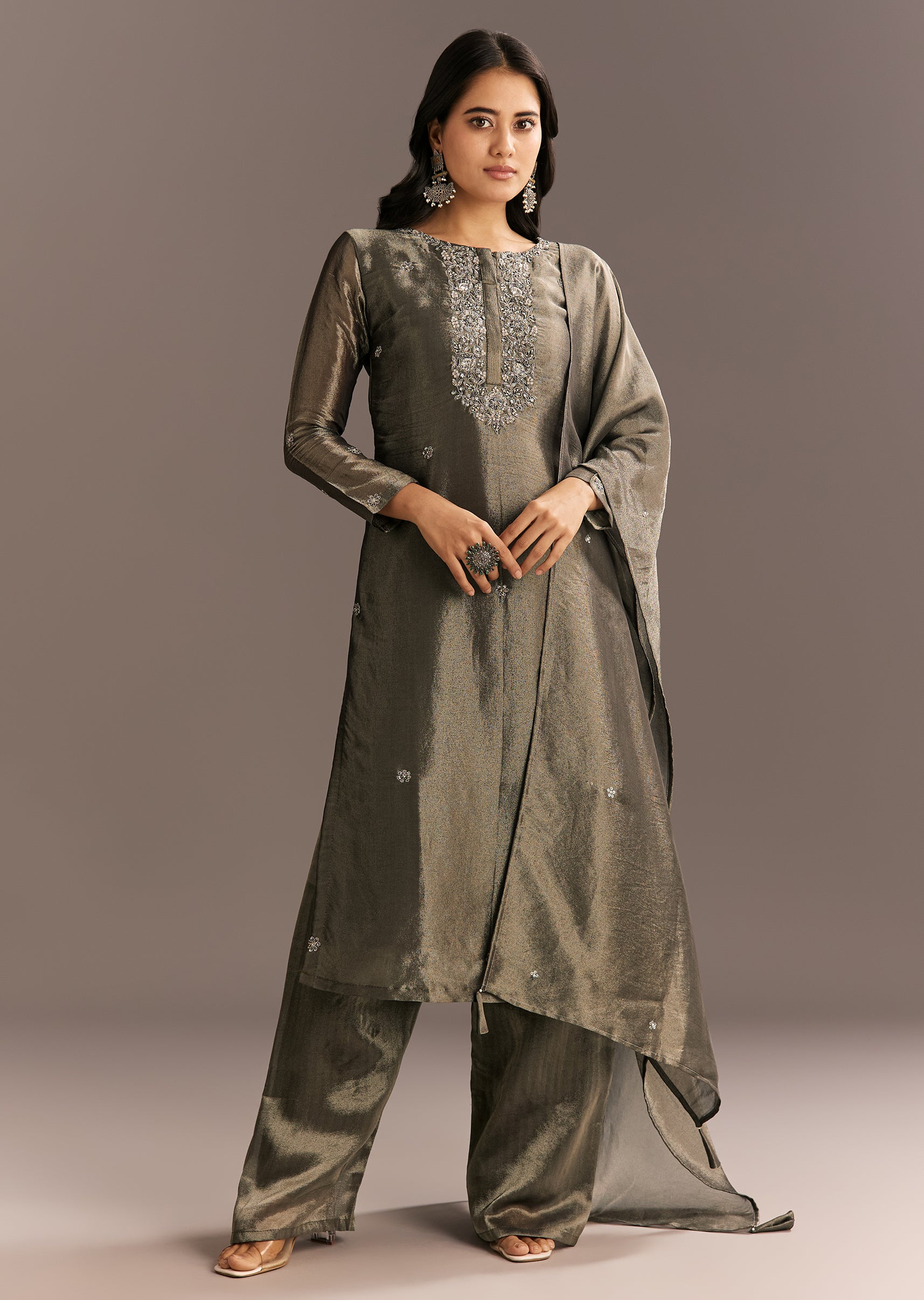 Dark Grey Tissue Kurta Pant Set With Butti Dupatta