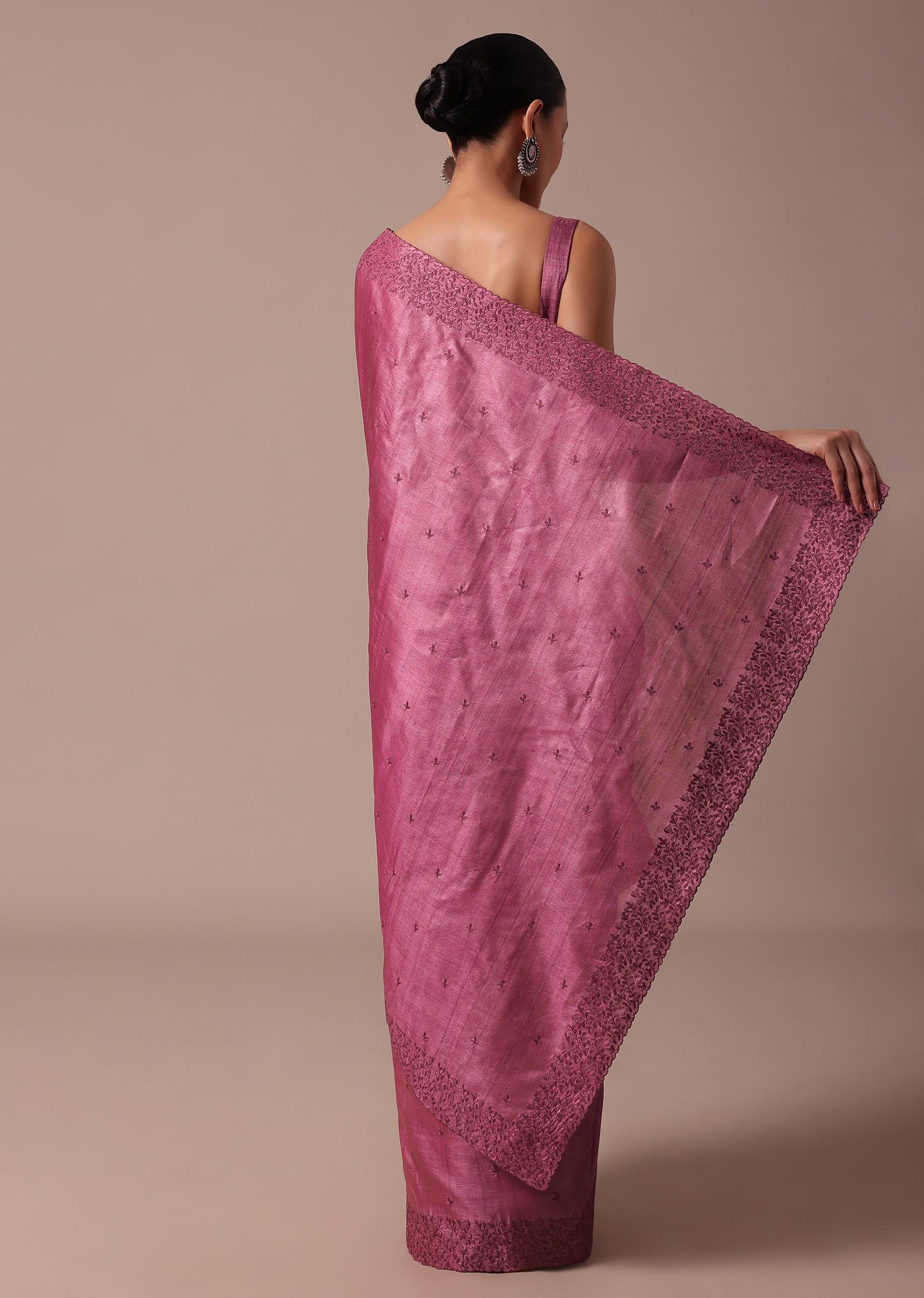 - Indulge in grandeur with this dark pink saree embellished with resham embroidery.