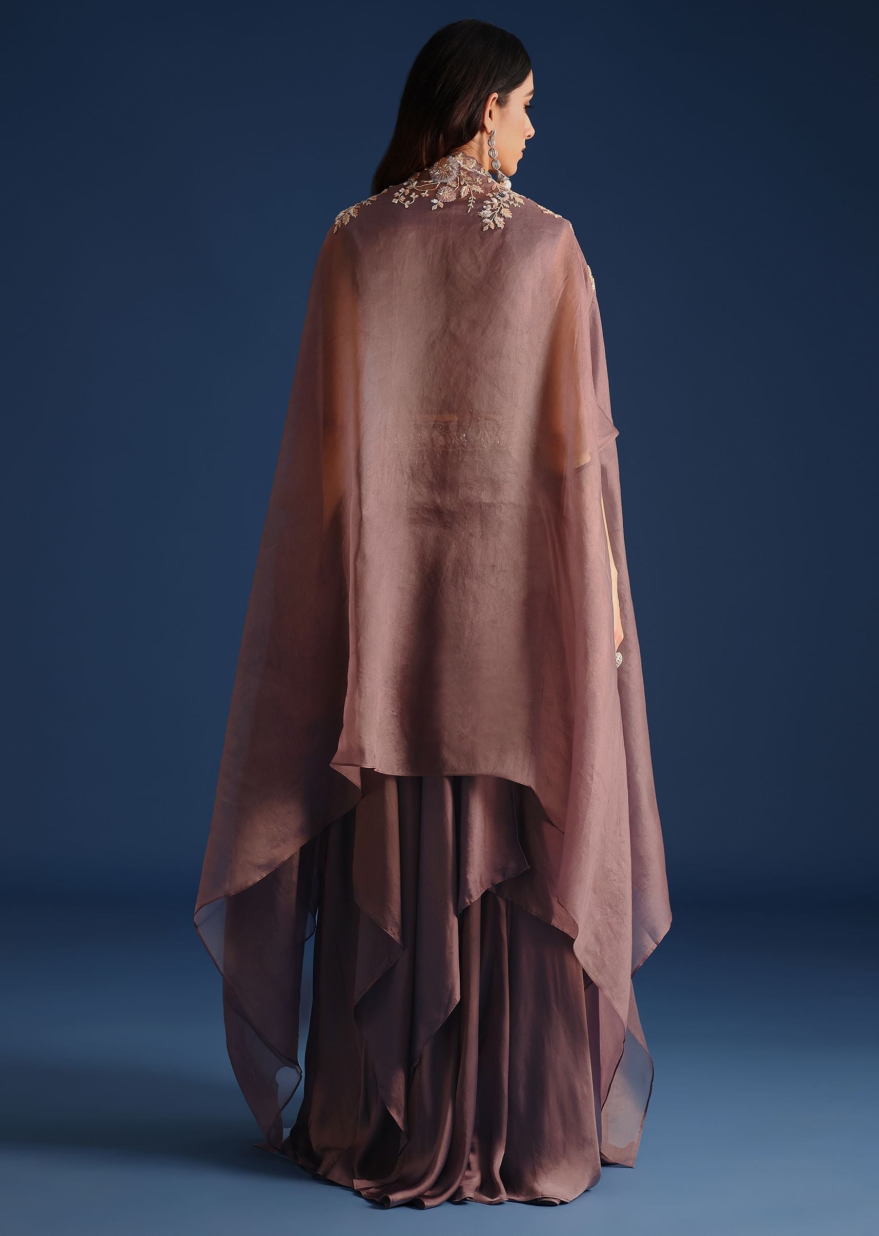 - The whimsical satin skirt and organza asymmetric jacket elevates the fusion ensemble to new heights of sophistication.