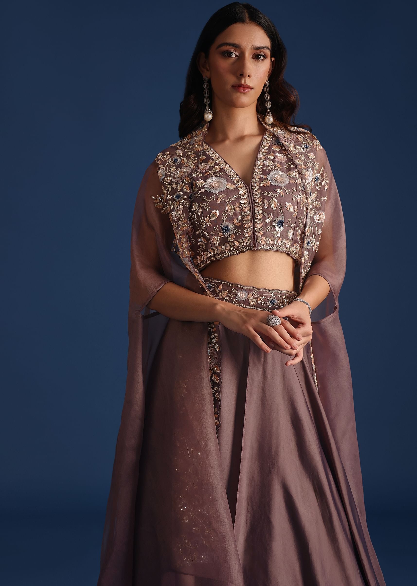 Dark Purple Jacket With Sequin Crop Top And Skirt