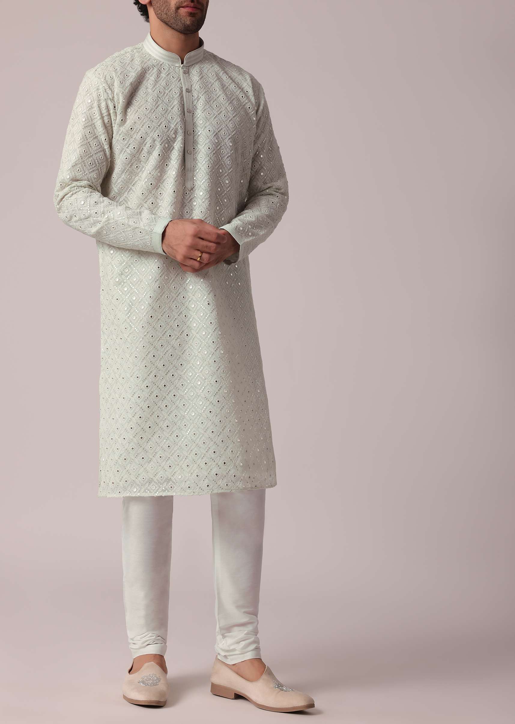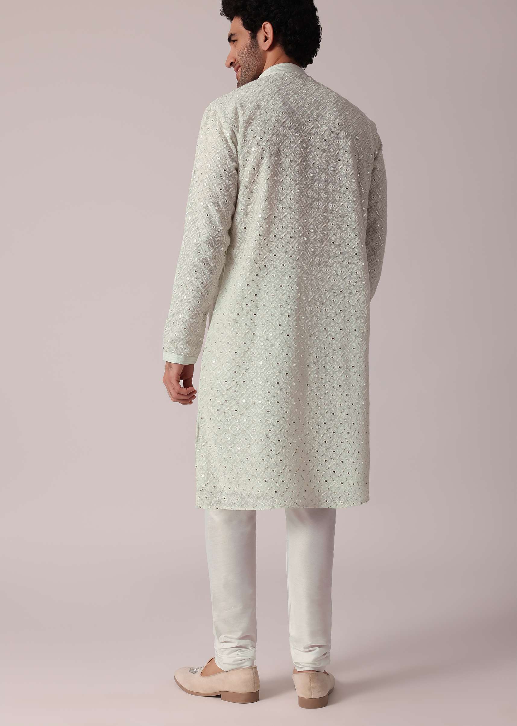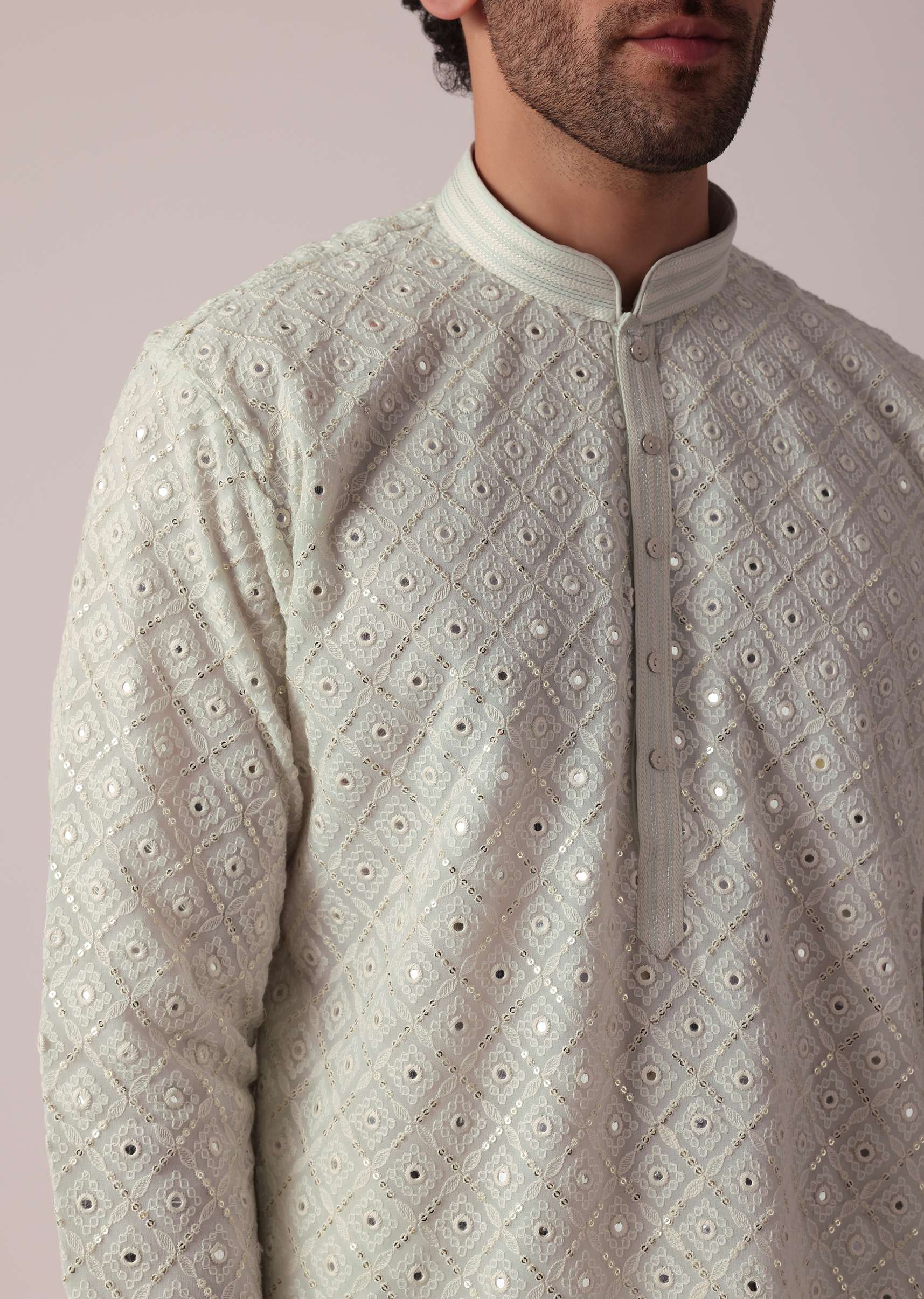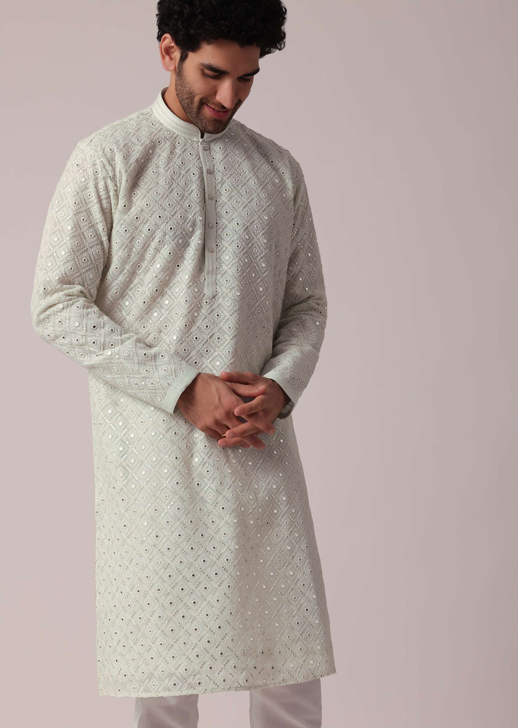 - It features a mesmerizing display of sequins and thread work adorning the entirety of the kurta.