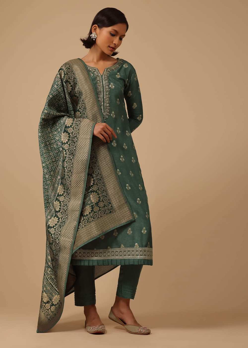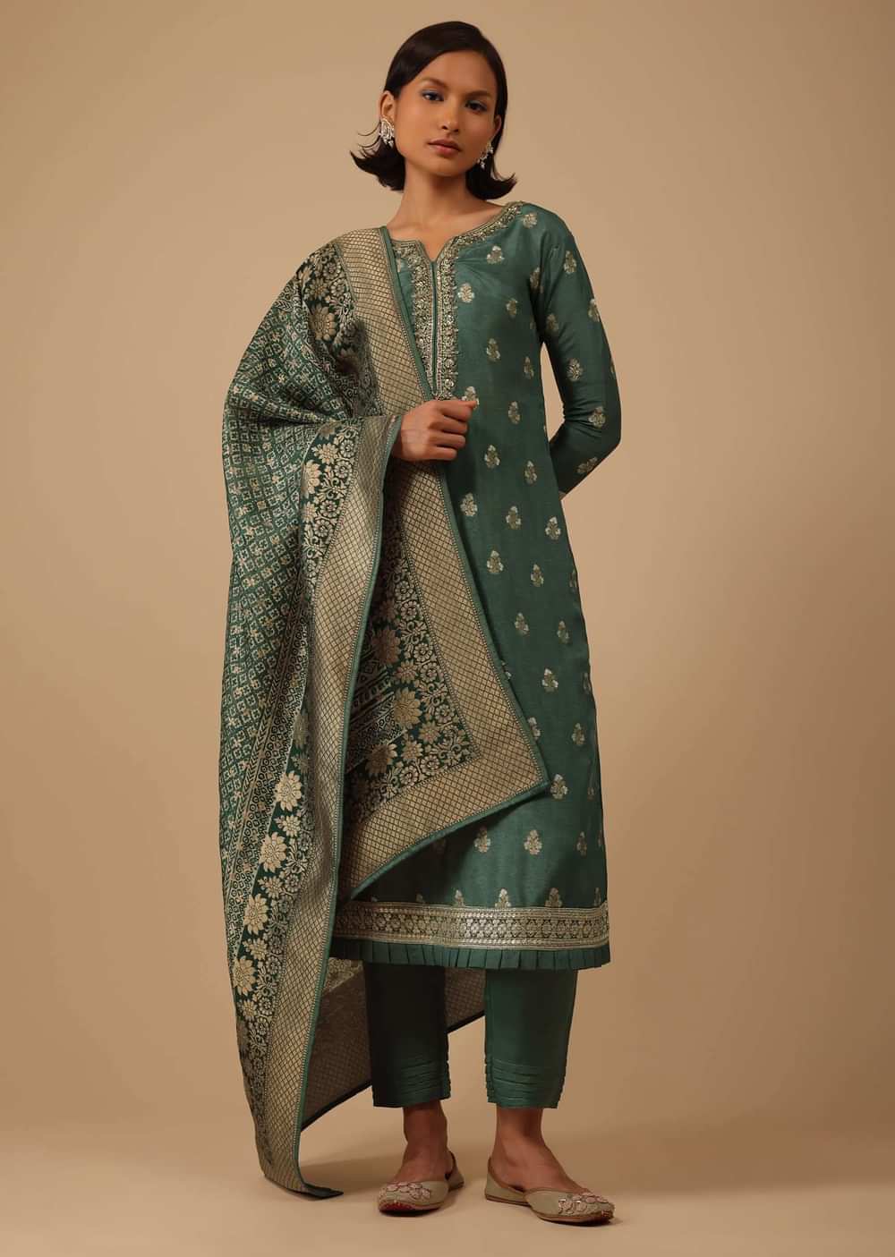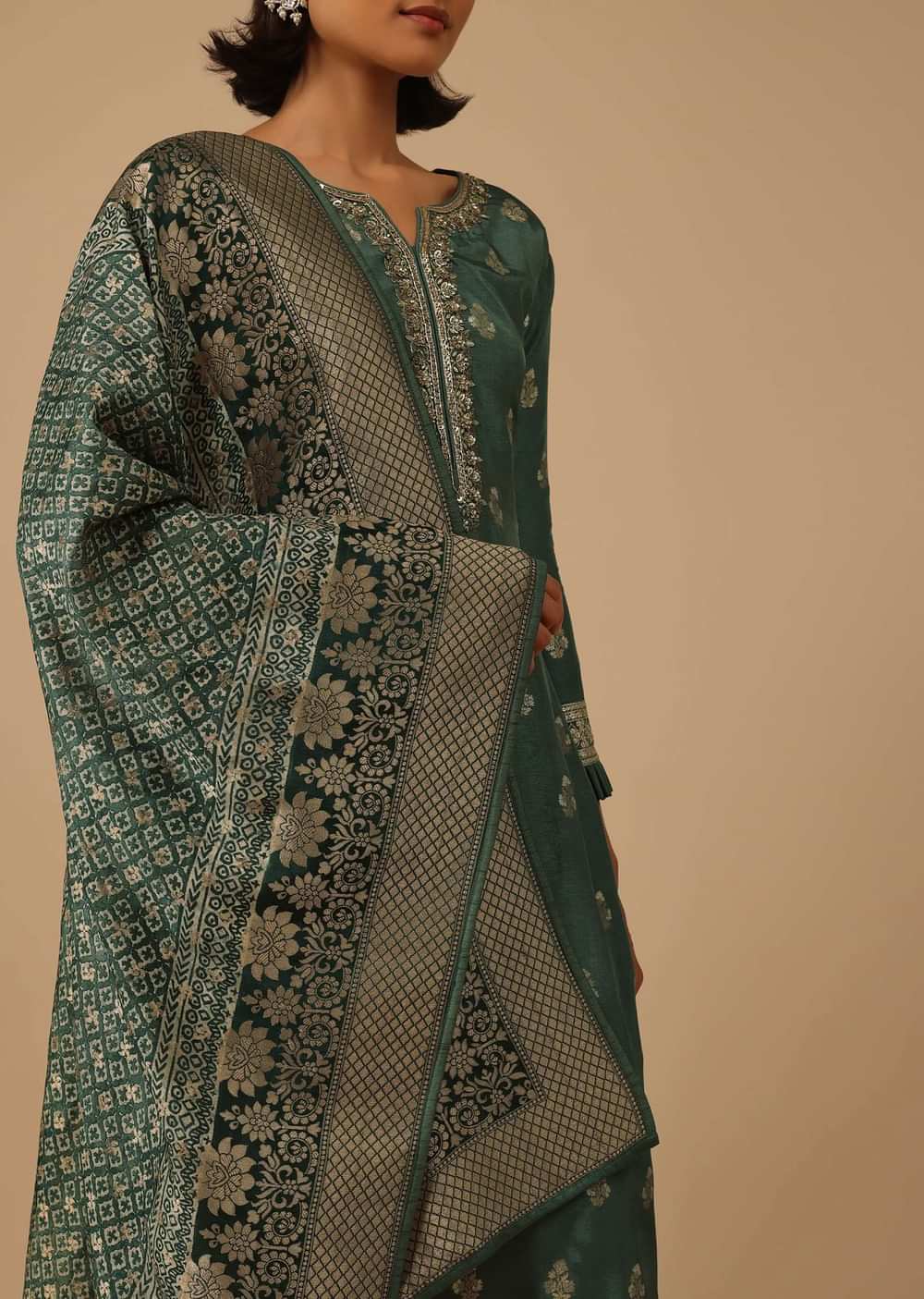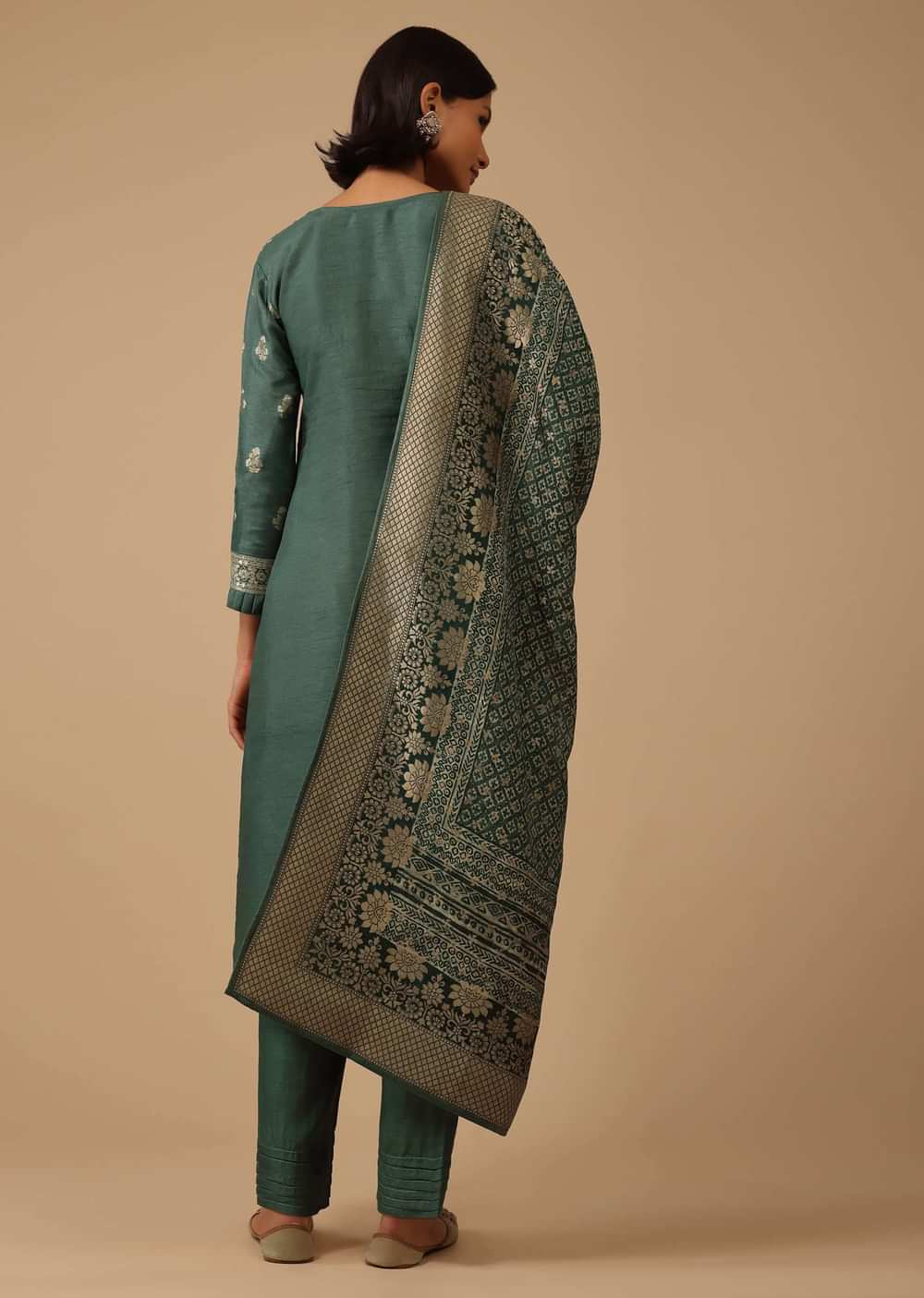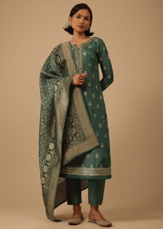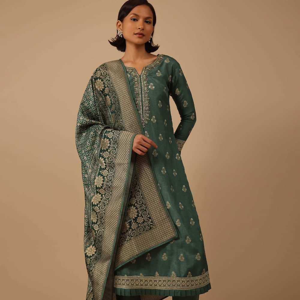 - The set comes with a heavy brocade dupatta that adds a grandiose feel to the ensemble.
