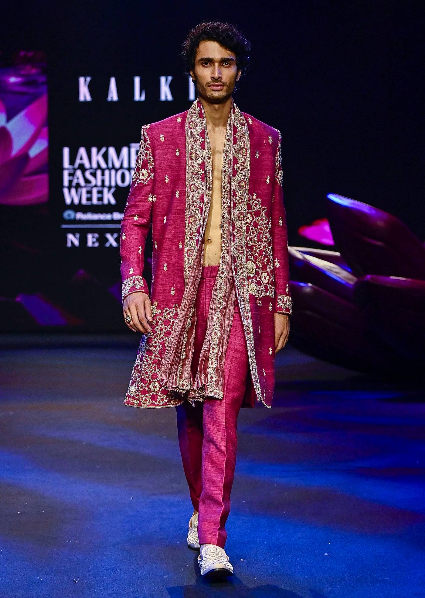 • Embrace regal elegance with our stunning deep magenta sherwani featuring exquisite selfhand embroidered floral motifs that bring a touch of sophistication to your ensemble.