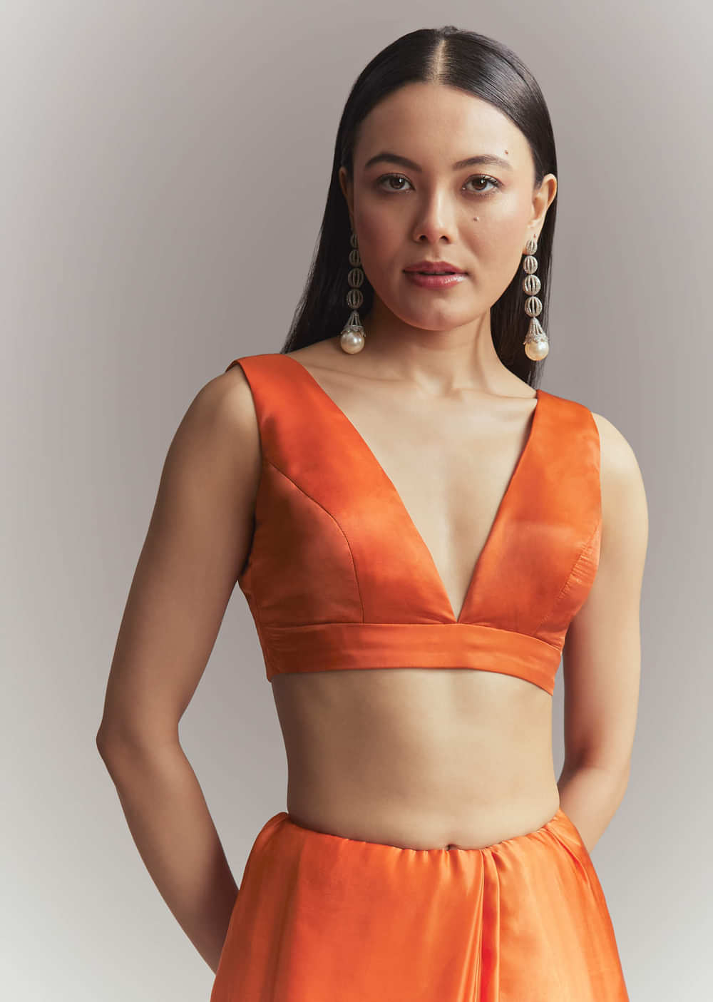 Dusky shades always bring depth, and this dusky orange satin embroidered saree radiates a festive energy. Zardosi, cutdana, sequins and beads come together on the border and buttis to create richness. This saree lets a bridesmaid or guest look celebratory and confident at mehendi or wedding ceremonies. Awarded as the Most Trusted Brand, we're delivering styles you love, just as promised.