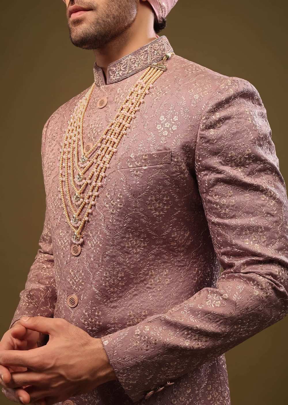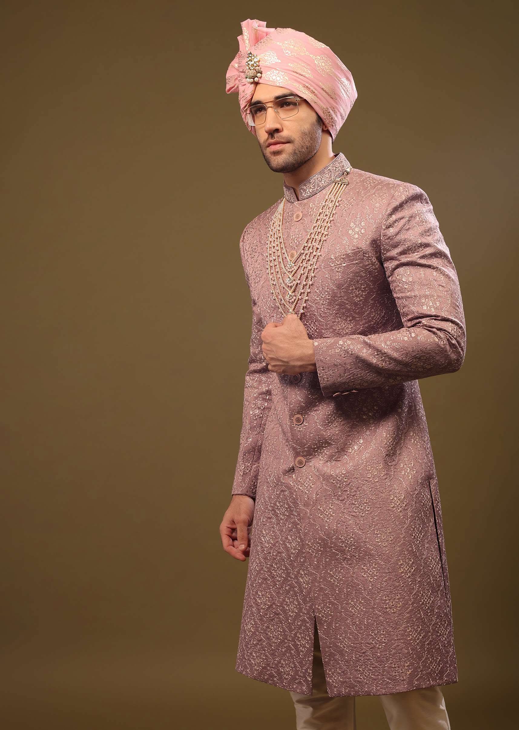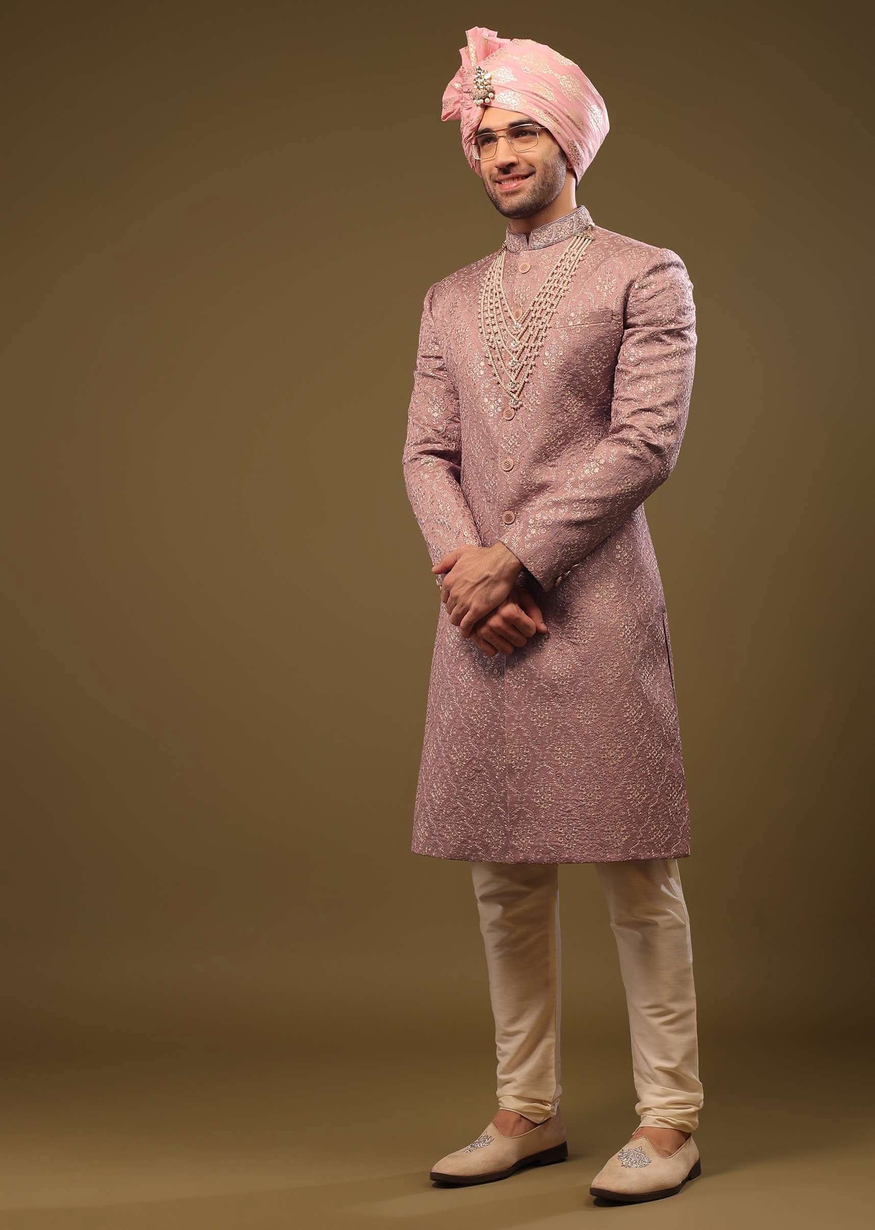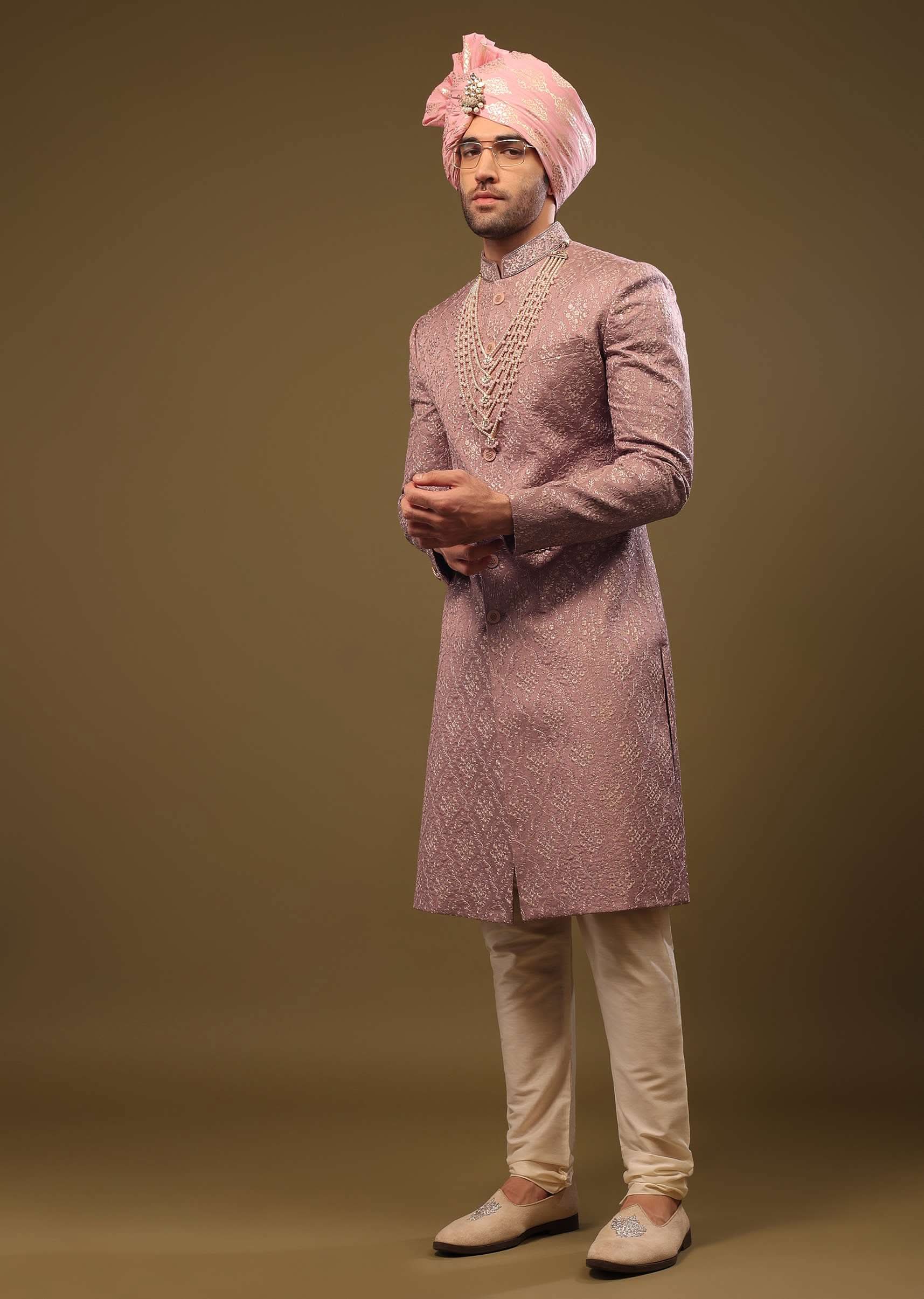 Dusty Pink Purple Thread Embroidered Sherwani Set In Silk